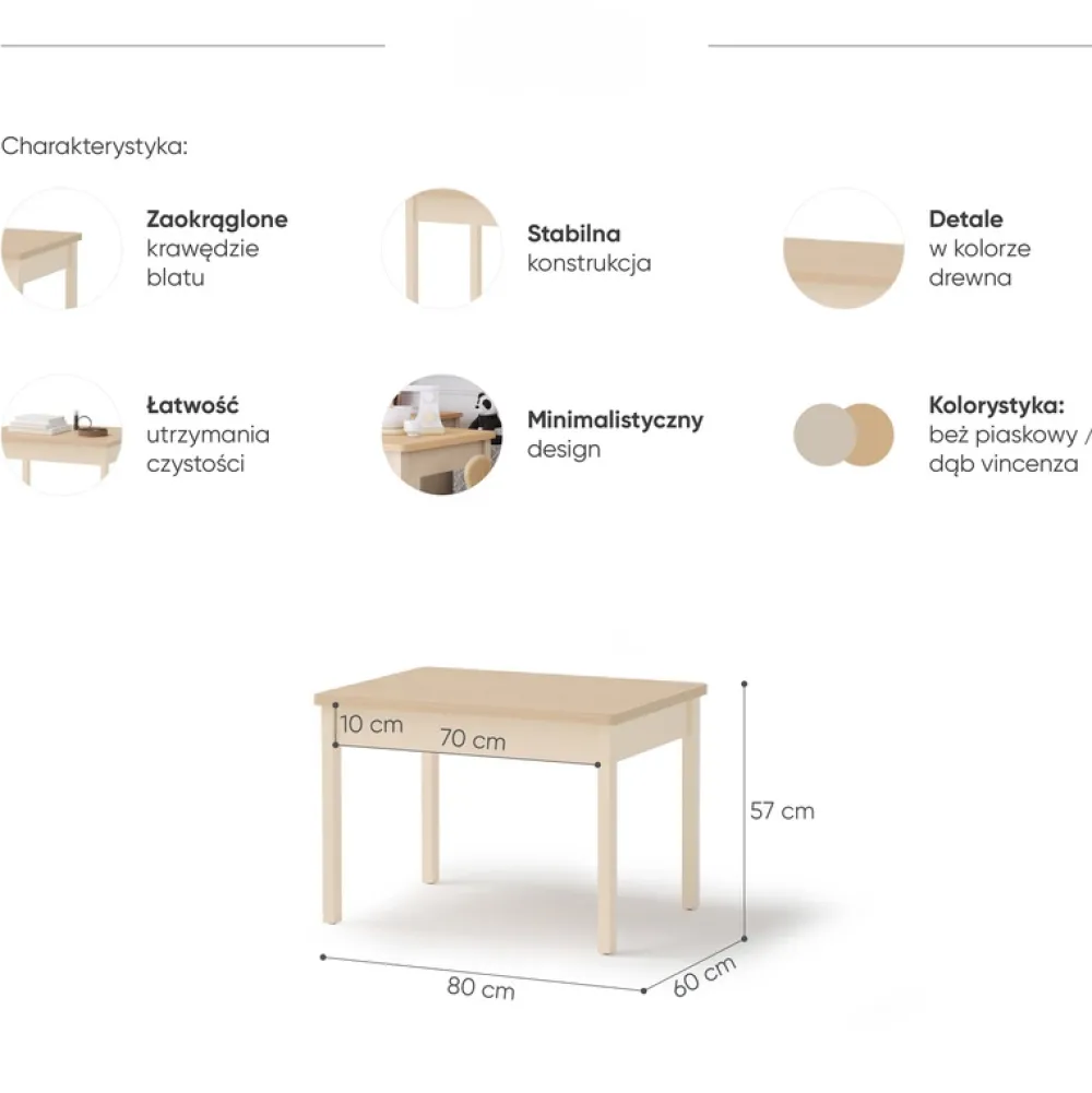 - Stolik kawowy STORY 80×60×57 cm w kolorze beż piaskowy/ dąb vincenza. Blat 25 mm z zaokrąglonymi krawędziami i obrzeżem ABS. Korpus z płyty laminowanej 16 korpus oraz 25 mm blat. Kompaktowy, stabilny mebel do nauki, pracy lub jako stolik pomocniczy.