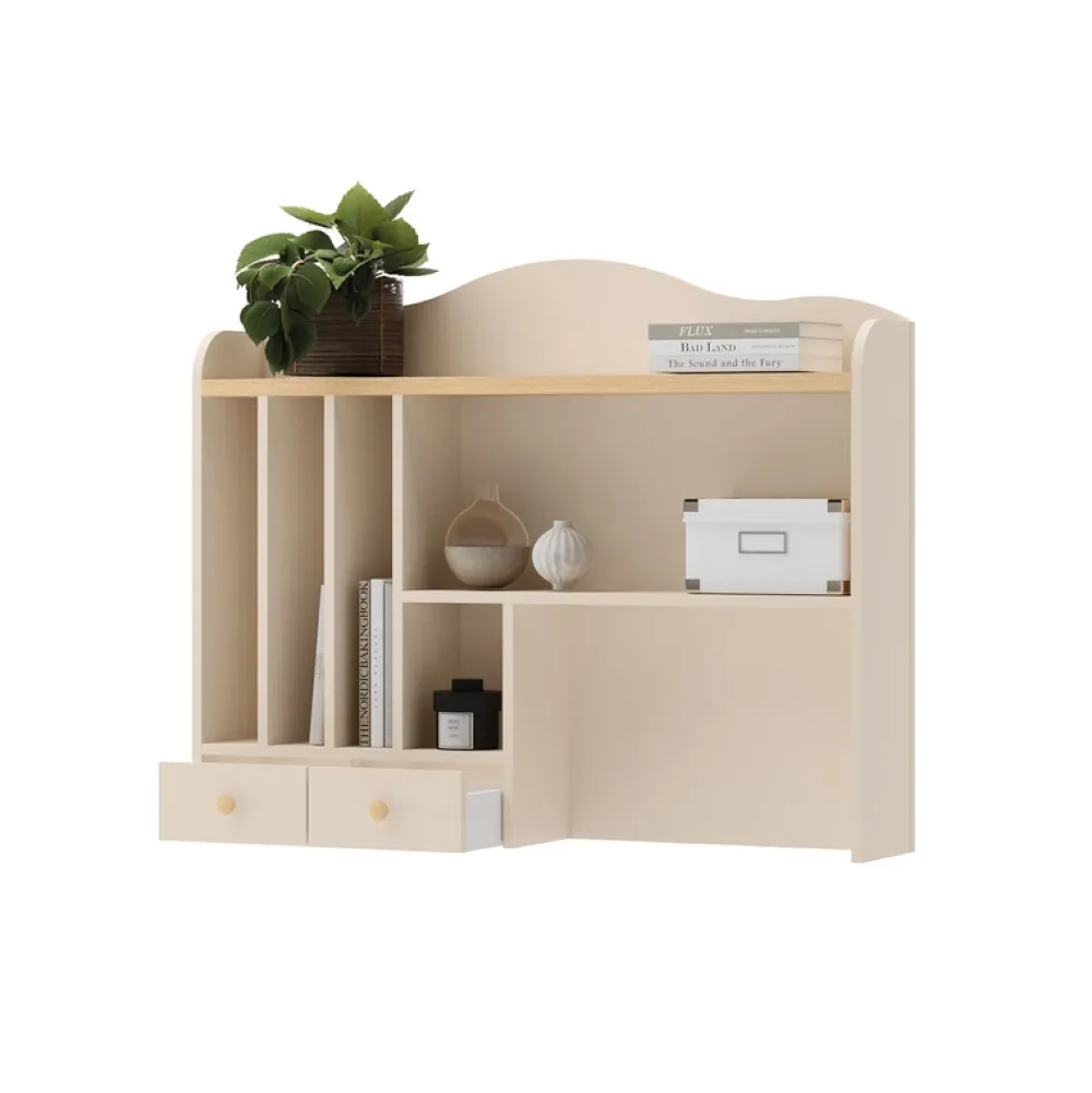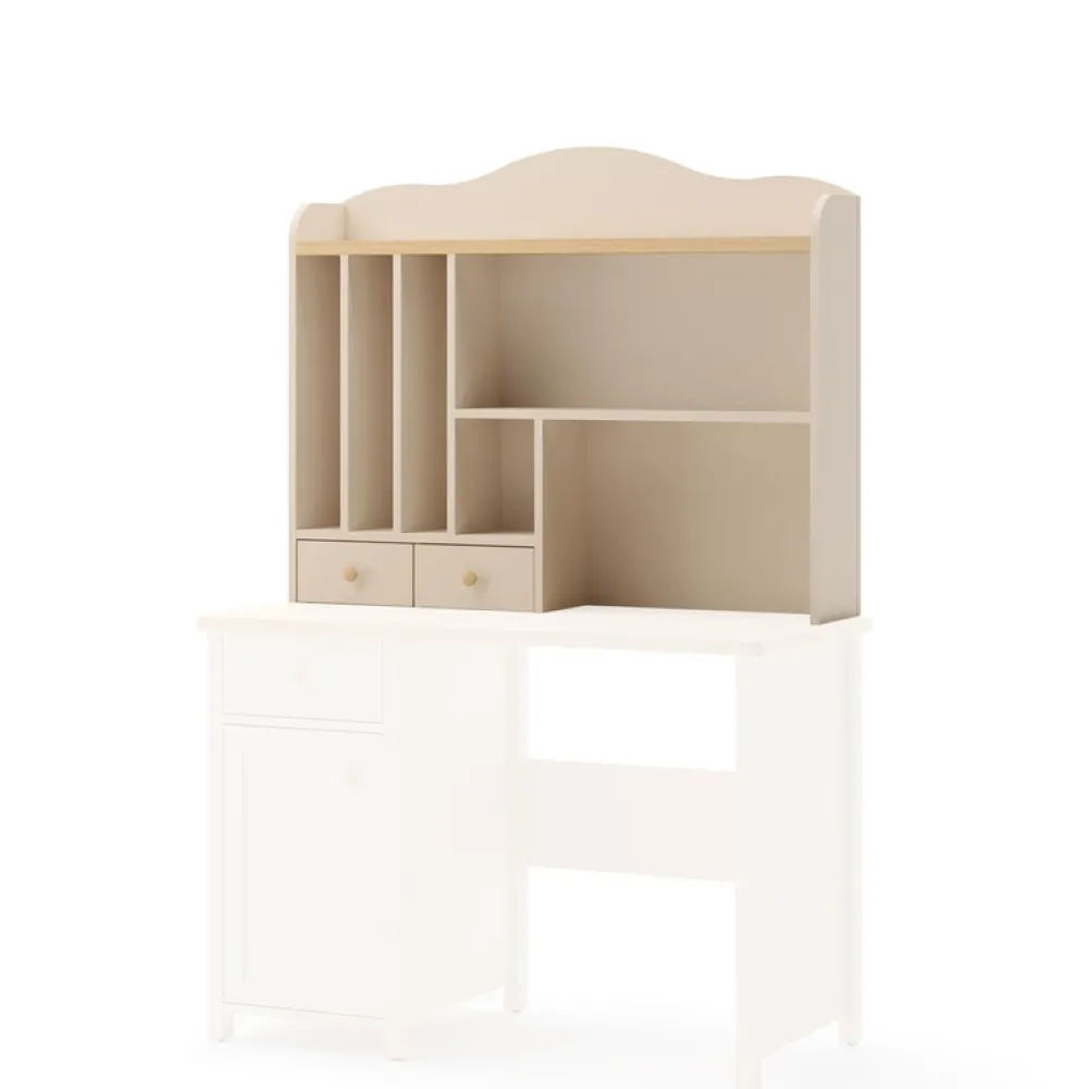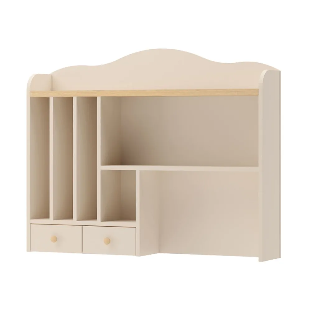 Nadstawka na biurko STORY to praktyczny dodatek, który pozwala maksymalnie wykorzystać przestrzeń roboczą. Wyposażona w trzy otwarte półki oraz dwie wygodne szufladki, sprawia, że wszystkie przybory biurowe, dokumenty i dekoracje zyskują swoje miejsce. Dzięki niej utrzymasz porządek na blacie, a jednocześnie zyskasz dodatkową powierzchnię do przechowywania w estetycznej formie. Beż piaskowy korpus z detalami w dekorze dąb vincenza bielona wprowadza do wnętrza harmonię i naturalny akcent.