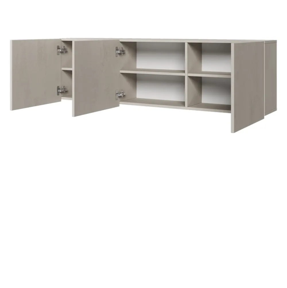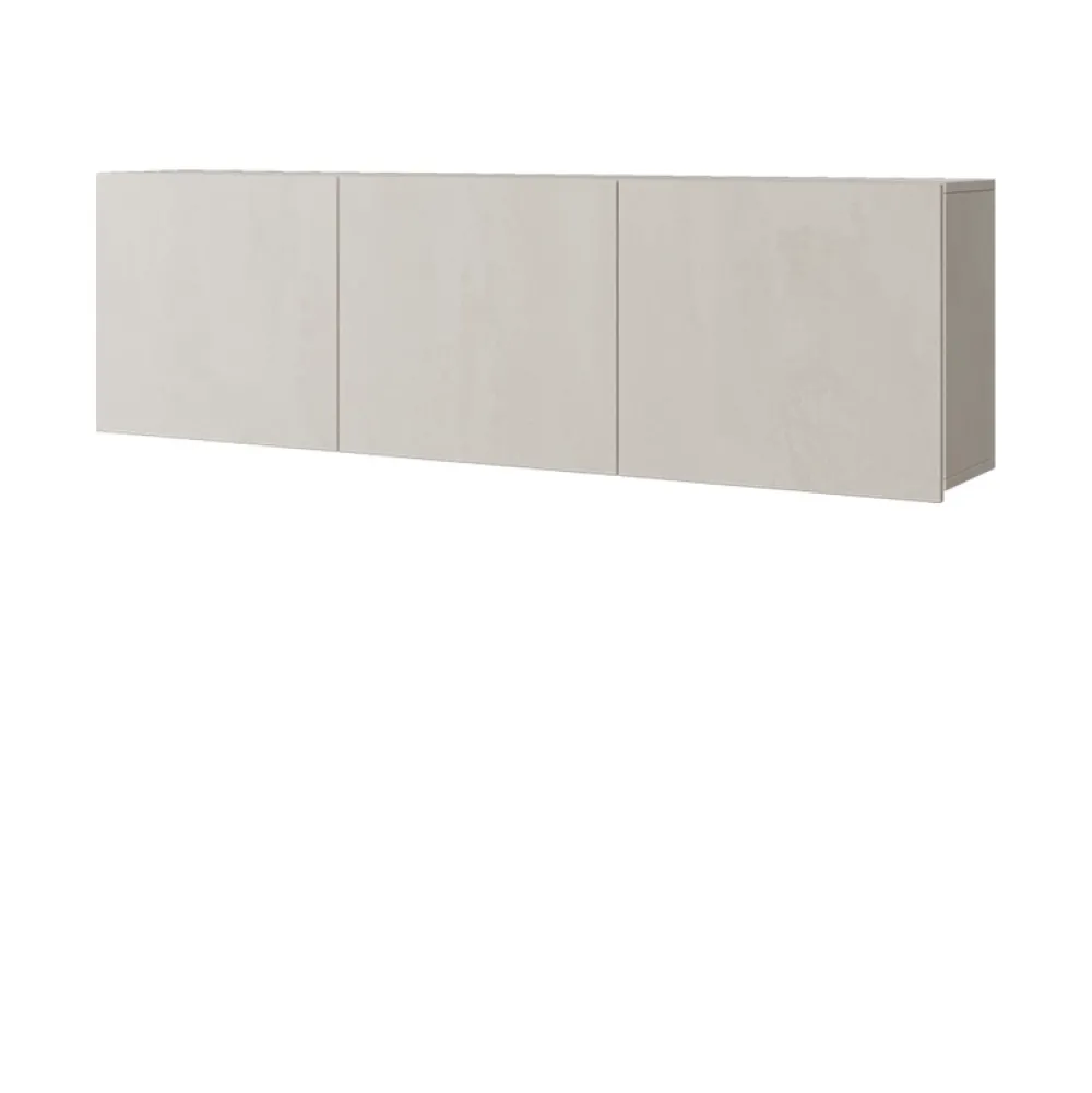 Szafka wisząca z trzema drzwiami to świetne rozwiązanie do przechowywania, które pozwala zaoszczędzić miejsce na podłodze, jednocześnie dodając wnętrzu lekkości. Proste, gładkie fronty w subtelnym odcieniu szarości podkreślają nowoczesny charakter zestawu. Wnętrze szafki jest podzielone na trzy przegrody, co ułatwia organizację przestrzeni.