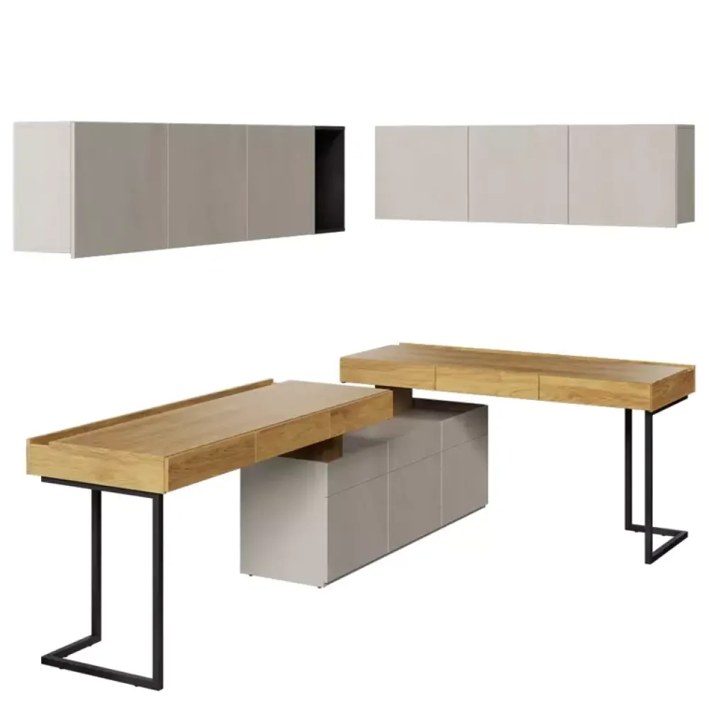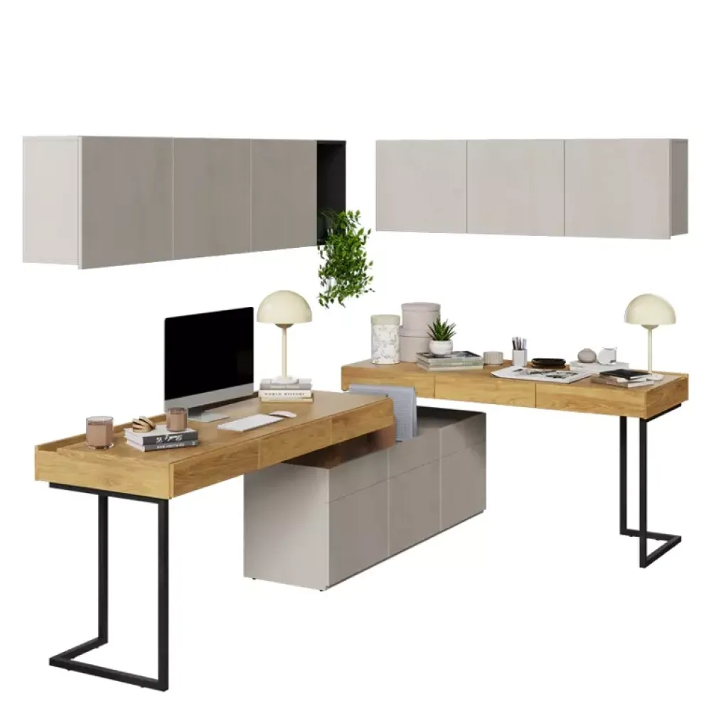 Zestaw składa się z dwóch biurek o szerokości 150 cm, które zostały wyposażone w nóżki wykonane z metalu w czarnym kolorze oraz trzy pojemne szuflady na akcesoria osadzone na prowadnicach kulkowych. Biurka młodzieżowe opierają się na szafce trzydrzwiowej pozwalającej na przechowanie przedmiotów.