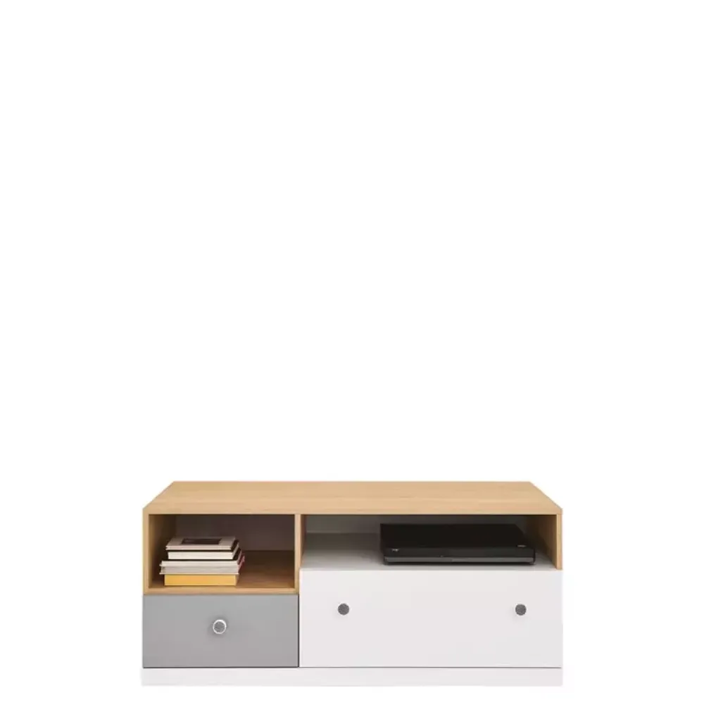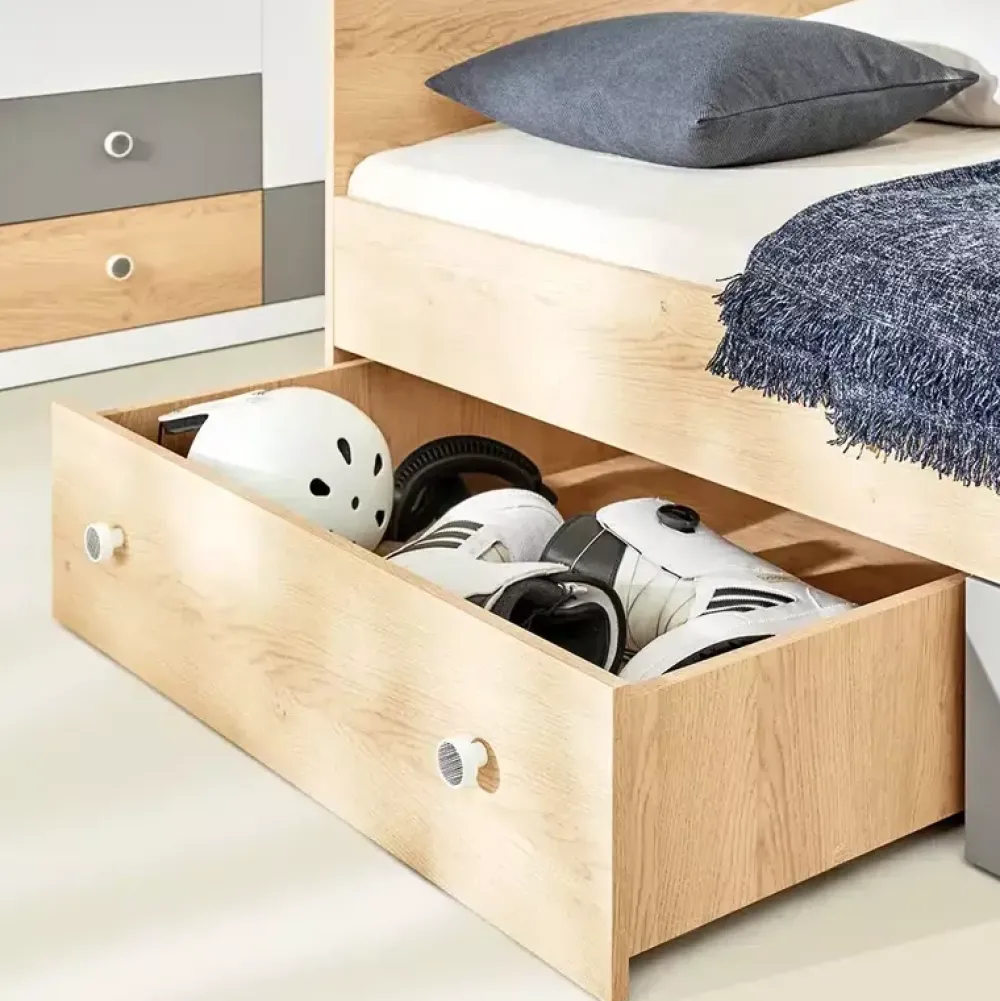 - Meble młodzieżowe z kolekcji PATHE. Korpusy w kolorze dębu biszkoptowego. Fronty w kolorach bieli, szarości oraz dębu biszkoptowego. W skład zestawu wchodzi szafa trzydrzwiowa, biurko, mała komoda, szafka RTV, półka wisząca oraz łóżko.