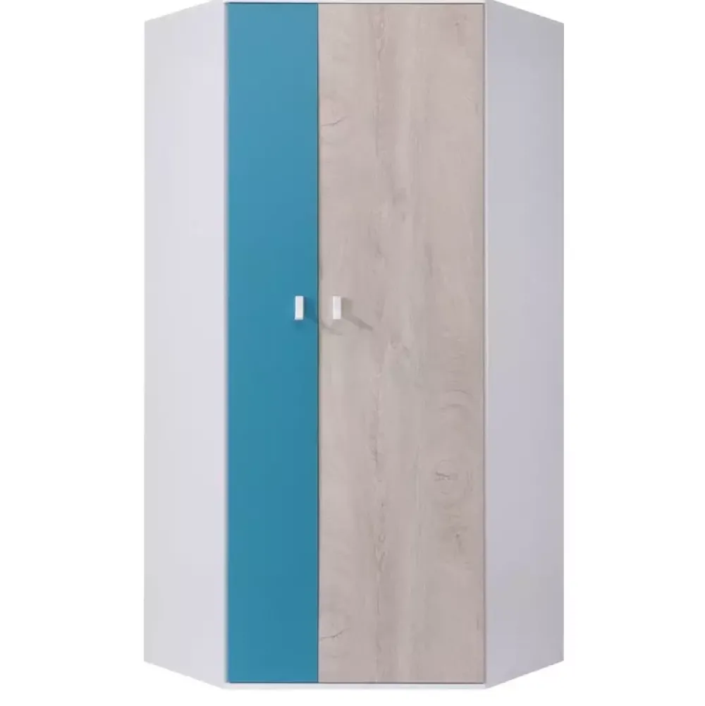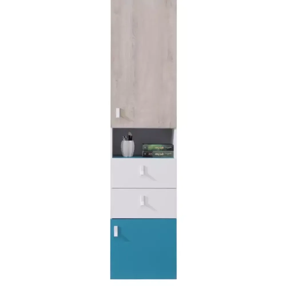 - Meble do pokoju młodzieżowego PRESSCOT gdzie znalazła się szafa narożna z dużą przestrzenią na wieszaki, biurko z szafką, łóżko z pojemnikiem z wysuwanym panelem z półkami, regału z szufladami i uzupełniającej zestaw półki na książki.