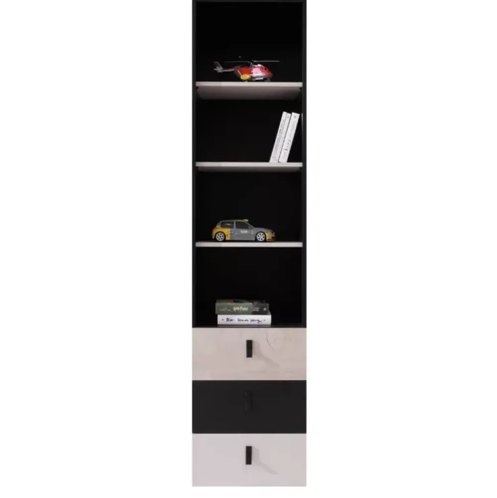 Meble do pokoju młodzieżowego z kolekcji PRESSCOT w skład których wchodzi szafa z półkami i drążkiem na wieszaki, która dzięki swojej bryle pomieści wiele ubrań, miejsce na twoje dekory i rozmaite akcesoria zapewni regał na książki, który posiada trzy półki oraz trzy szuflady. Biurko które znalazło miejsce w szufladzie, posiada dwie szuflady i szafkę, drugi regał posiada dwie półki na twoje akcesoria oraz trzy szuflady i drzwi, za którymi znajdują się półki, w których możesz umieścić ubrania lub inne akcesoria, jednak najlepszym rozwiązaniem na umiejscowienie twoich ubrań będzie komoda, która dzięki aż sześciu szufladom, oraz szafce zamykanej parą drzwi, stanowi bardzo pojemne rozwiązanie. Uzupełnieniem zestawu jest półka na książki, która dzięki nowoczesnemu wykonaniu przyciąga wzrok, dzięki czemu akcesoria, które na niej umieścisz, nie unikną spojrzeń.