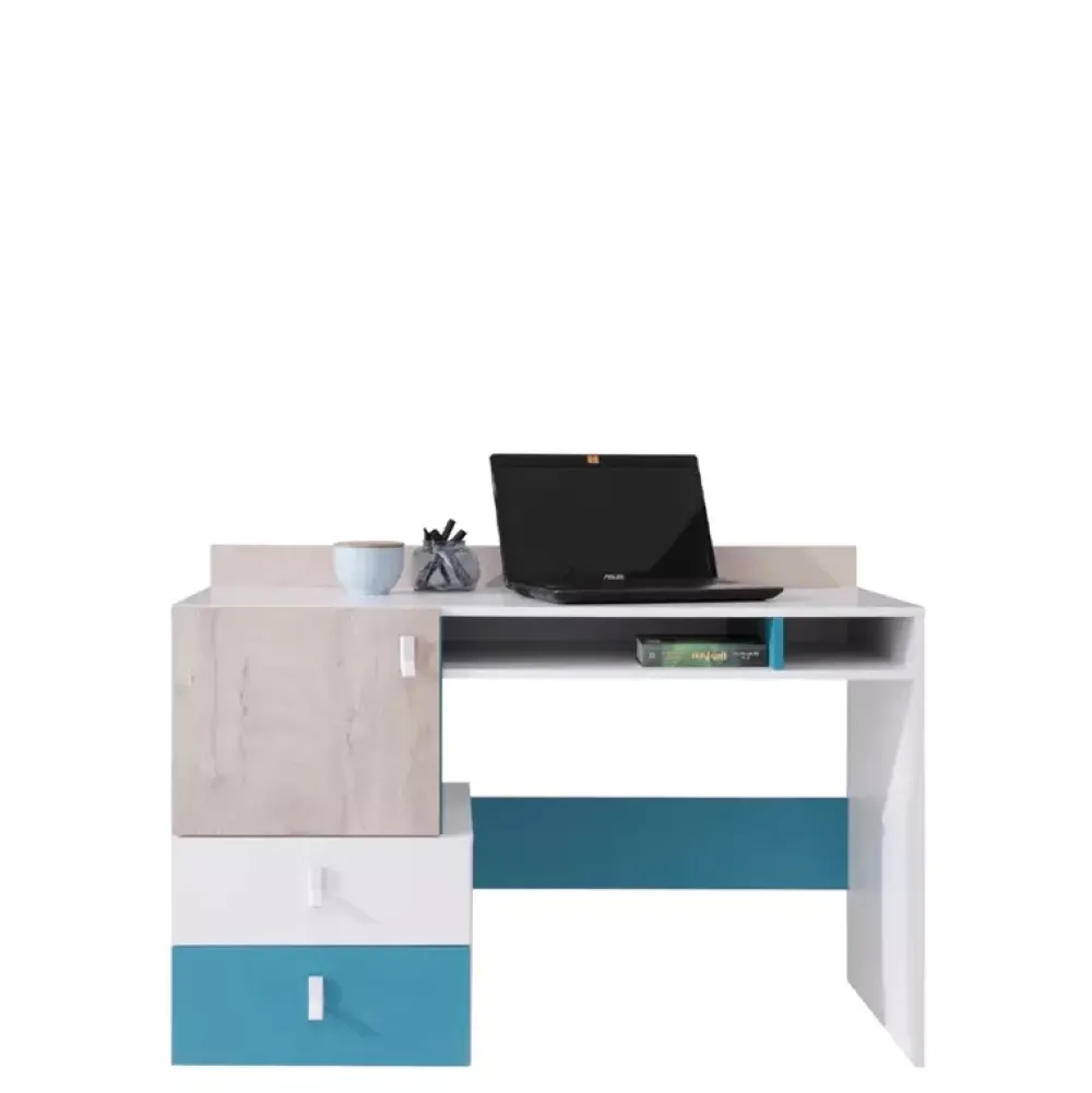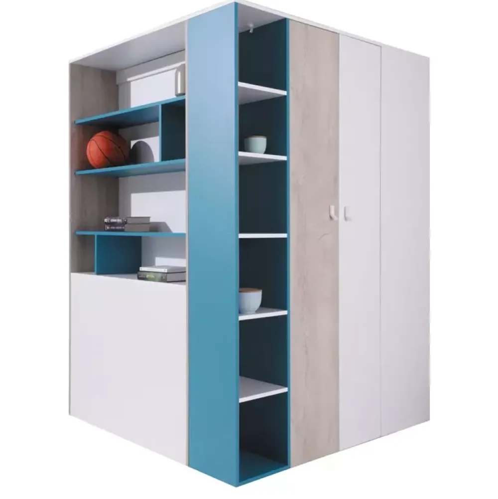 - Modne meble do pokoju młodzieżowego z kolekcji PRESSCOT w zestaw mebli wchodzi łóżko z wysuwanym panelem z półkami, szafa narożna w formie garderoby, regał z trzema otwartymi półkami, biurka z szafką, półki na książki oraz regału z szufladami.