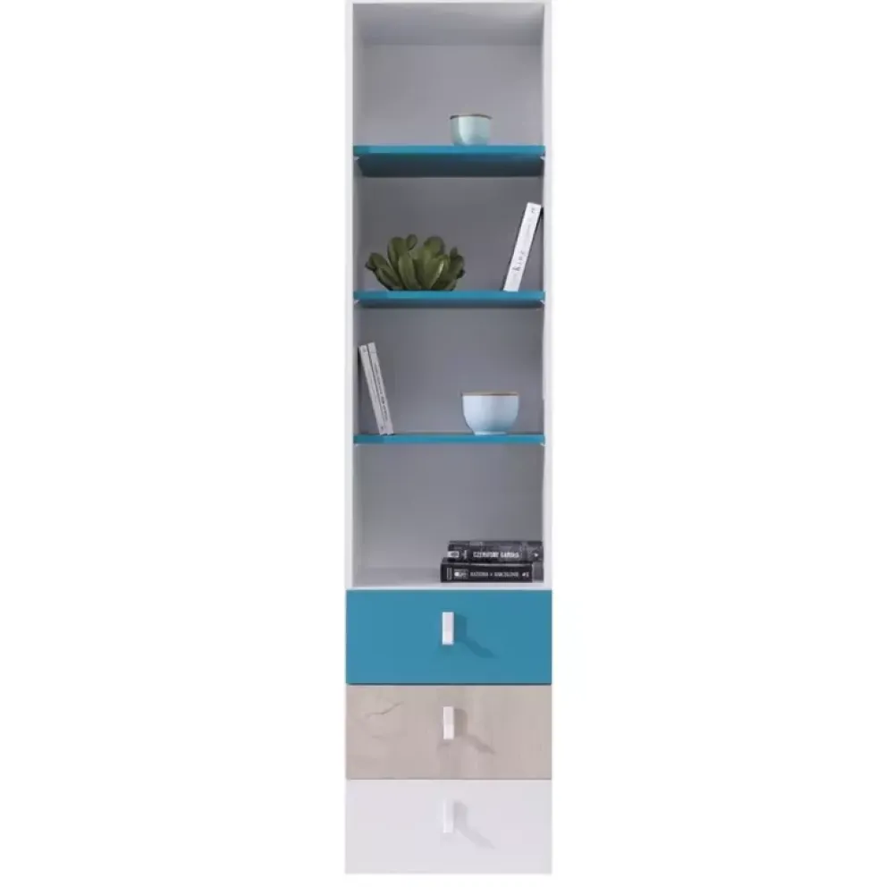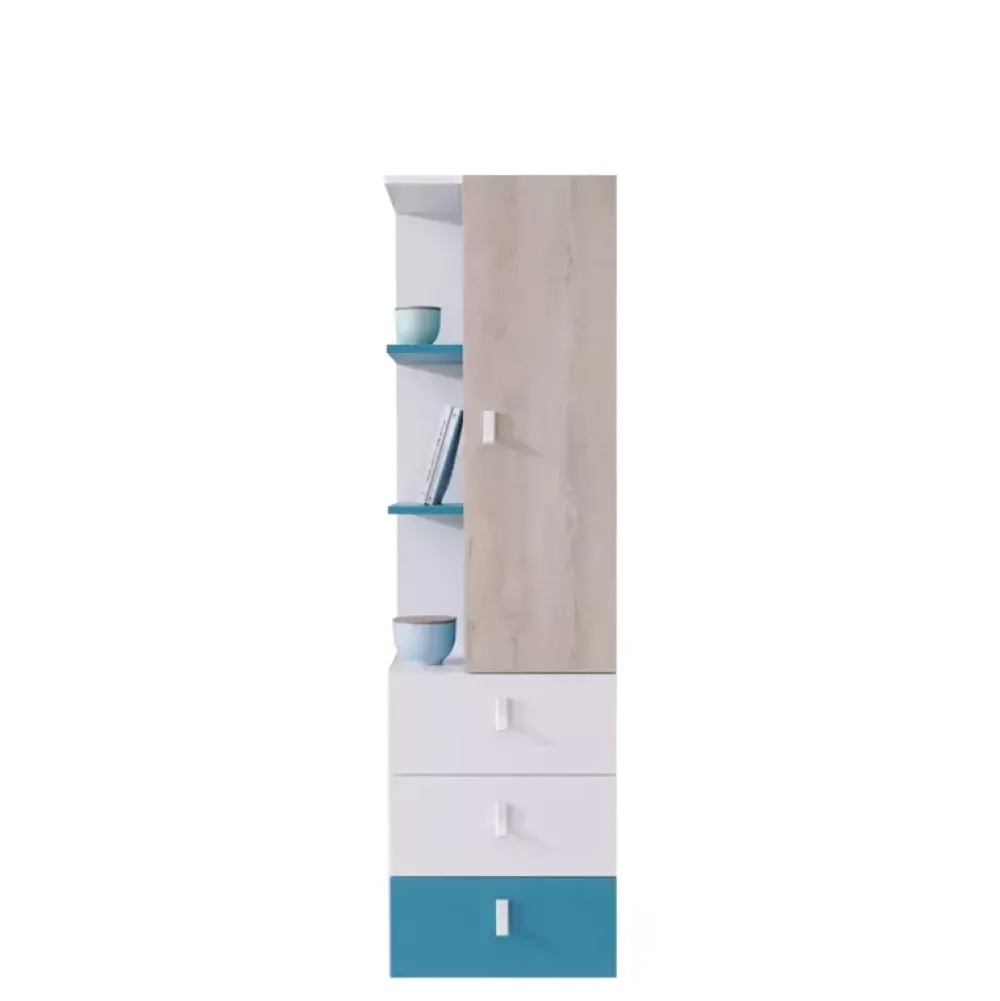 Modne meble to pokoju młodzieżowego z kolekcji mebli systemowych PRESSCOT których skład zawiera łóżko z miejscem na materac o wymiarach 90cm x 200cm i zmysłowy wysuwany panel z półkami. Szafa narożna w formie garderoby to pojemne rozwiązanie, dzięki któremu zyskasz dużo przestrzeni na swoje ubrania, dodatkowo została wyposażona w wiele półek na zewnątrz, na których umieszczone dekory i kwiatki ożywią twoje pomieszczenie. Biurko zostało wyposażone w dwie szuflady i szafkę, a pod biurkiem znalazła się wnęka, dzięki której zyskasz szybki i prosty dostęp do najpotrzebniejszych akcesoriów. Regał z otwartymi półkami posiada miejsce na twoje ubrania w trzech szufladach i dwóch półkach za drzwiami. Uzupełnieniem pozostała półka na książki zdobiąca pomieszczenie dekorami, jakie na niej umieścisz.