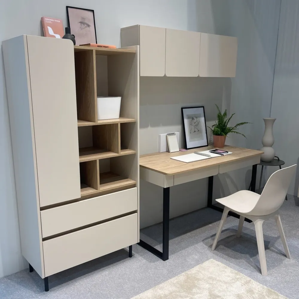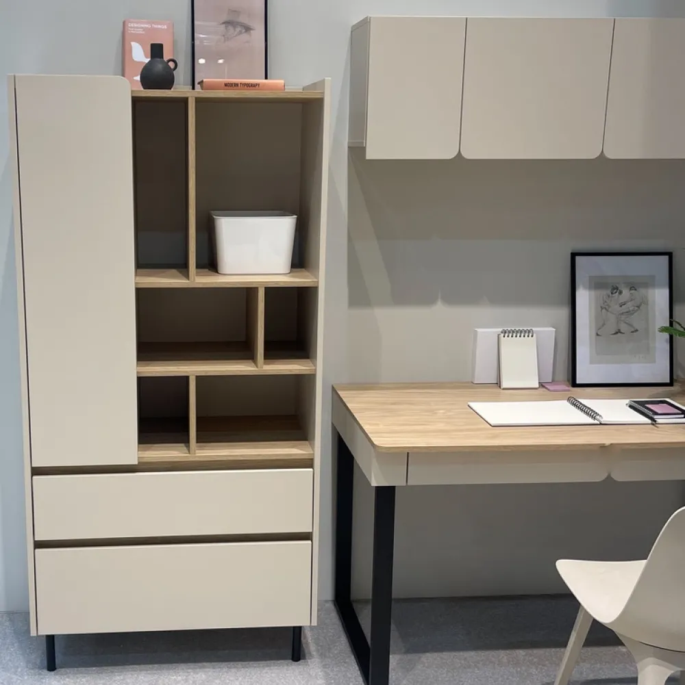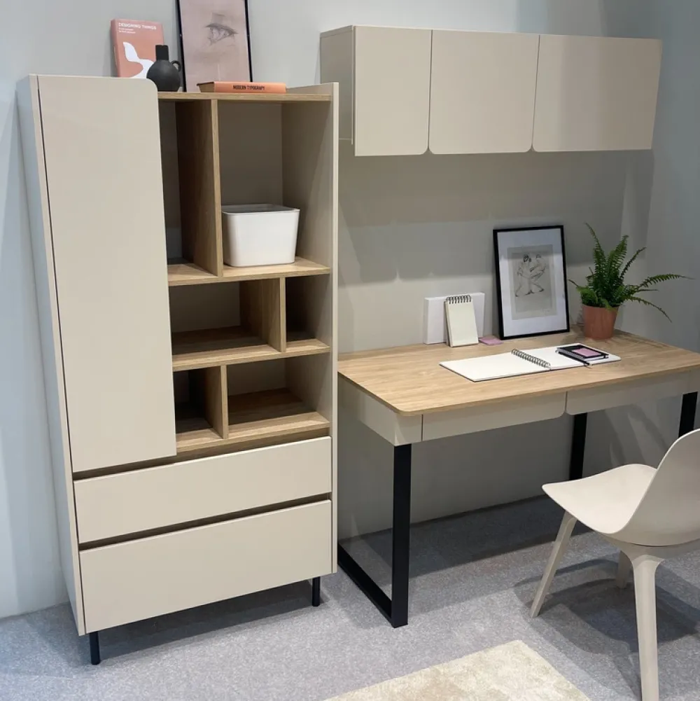 Stylowe połączenie kolorów – beż piaskowy z dębem olejowanym lub eukaliptus z dębem baltic dune – nadaje biurku nowoczesnego i ciepłego charakteru, doskonale wpisując się w młodzieżową estetykę. Obrzeża zabezpieczone okleiną ABS zapewniają trwałość i odporność na codzienne użytkowanie, dzięki czemu biurko zachowuje swój elegancki wygląd przez lata.
