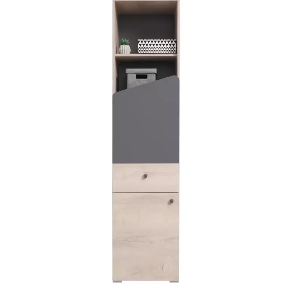 - Regał młodzieżowy o szerokości 45 cm wyposażony w szufladę oraz dwie szafki w tym jedną z drzwiami o nieregularnym kształcie, który odsłania w pełni jedną z półek.