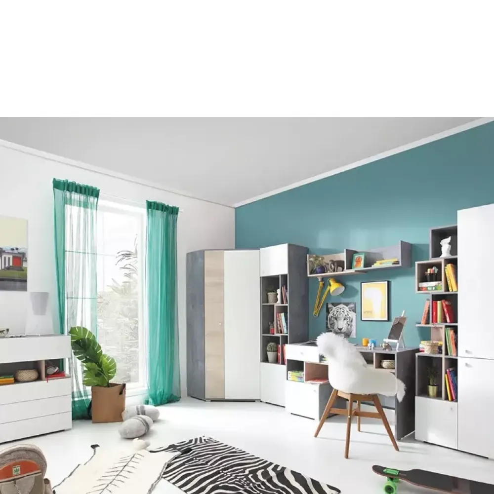 - Designerski zestaw mebli do pokoju młodzieżowego składający się z szafy narożnej z dwoma drążkami, dwóch regałów, biurka, otwartej półki wiszącej oraz komody z czterema szufladami. Korpusy w kolorze beton, białe fronty z akcentami w kolorze dębu.