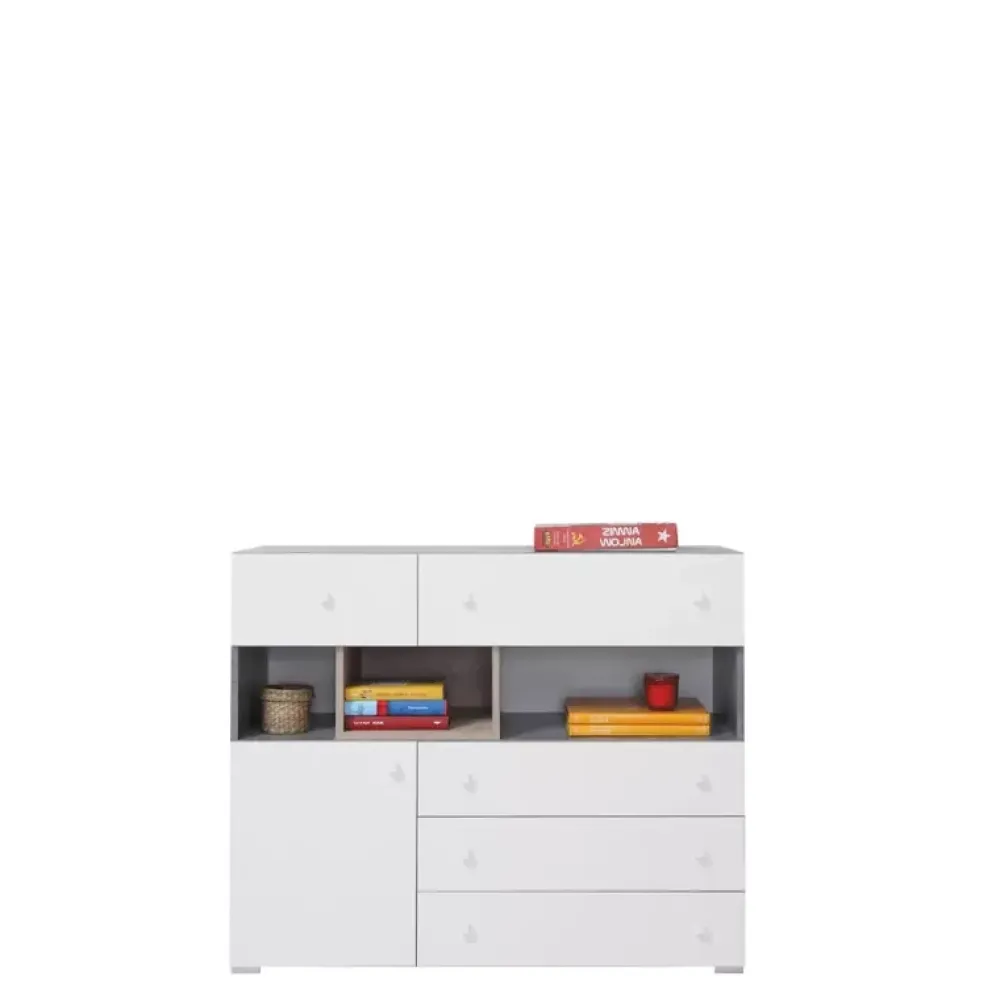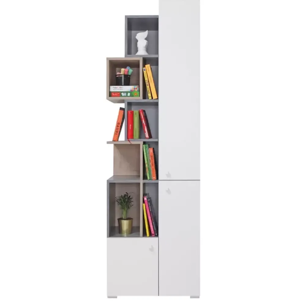Świetnie zaprojektowany zestaw mebli młodzieżowych SIREN, który odmieni pokój waszego dziecka. Składa się z sześciu brył, szafa narożna z dwoma wieszakami, rzędem kilku półek, komoda z czterema szufladami a na dodatek dwa regały z kilkoma szafkami, nie wspominając o kilkunastu otwartych półkach. Zapanowanie nad porządkiem w pokoju z tym zestawem będzie błahostką!