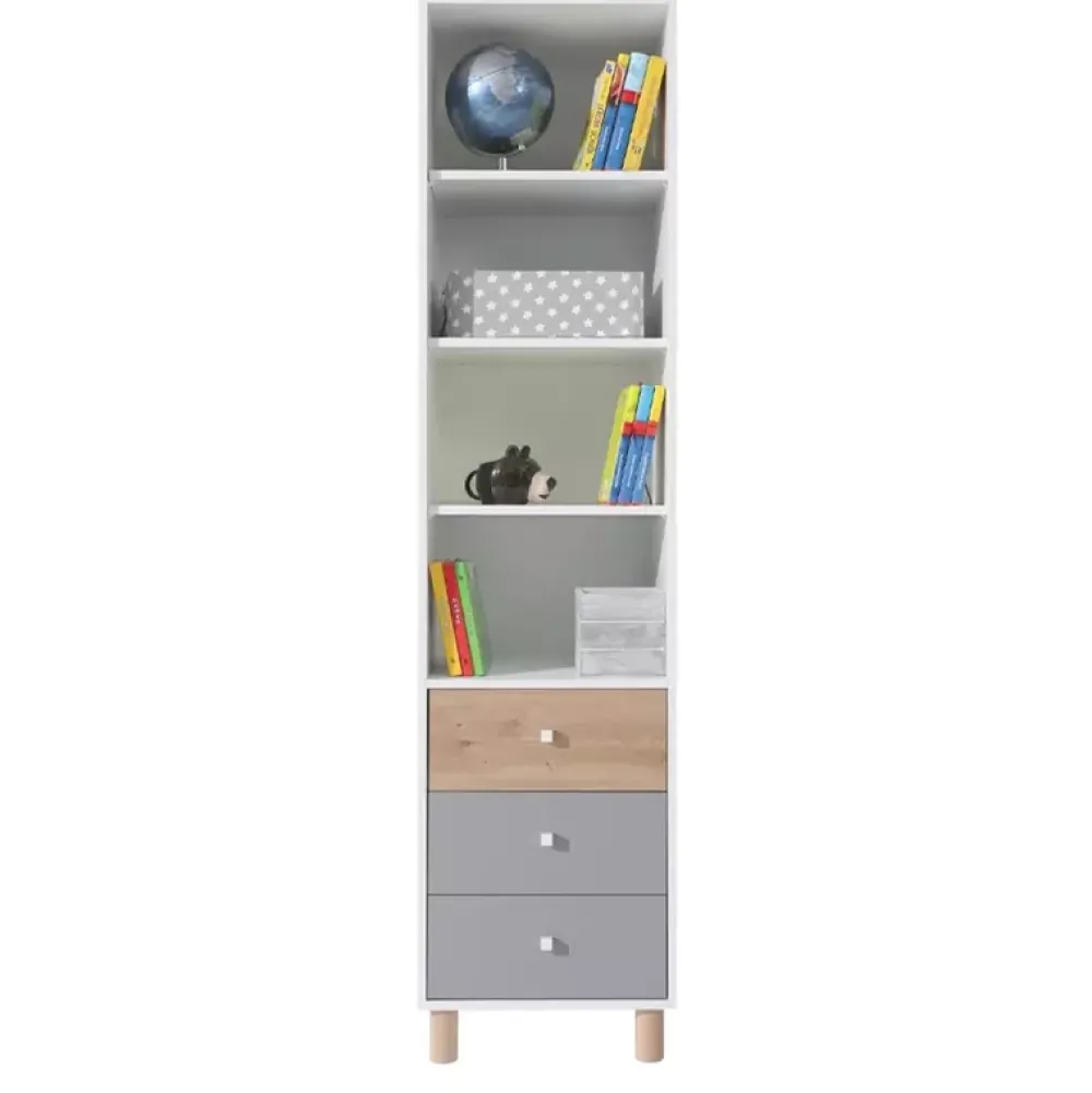 Regał do pokoju młodzieżowego z dwiema szufladami z frontami w kolorze szarym, oraz jedną szufladą z frontem w kolorze dąb artisan. Ponad szufladami znajduje się sekcja trzech półek dzieląca ją na cztery pojemne wnęki, w których będzie dostatecznie dużo miejsca na zdjęcia z wakacji, pamiątki z zagranicznych wycieczek lub inne przedmioty.