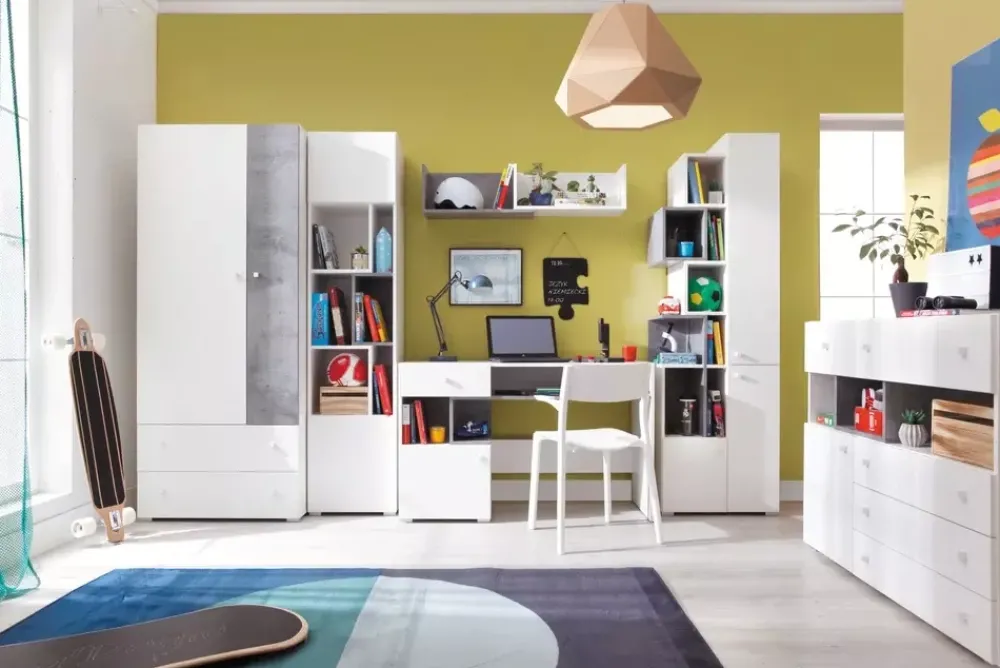 - Dwukolorowy korpus wykonany z laminowanej płyty wiórowej o grubości 16 mm w kolorze Białym oraz Beton.