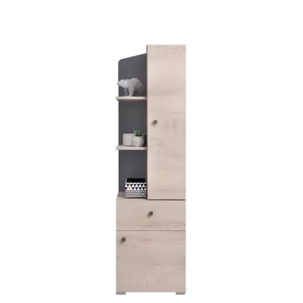 Regał do pokoju młodzieżowego, jeden z kilku dostępnych w kolekcji DAPHNE. Nieco inny od pozostałych regałów, lecz jego funkcjonalność na tym nie ucierpiała, wyposażono go w pojemną szafkę na dole, ponad którą znalazła się szuflada. Górna część regału została podzielona na dwie części, jedną otwartą z dwiema półkami, oraz drugą zamkniętą również z dwiema półkami wewnątrz.