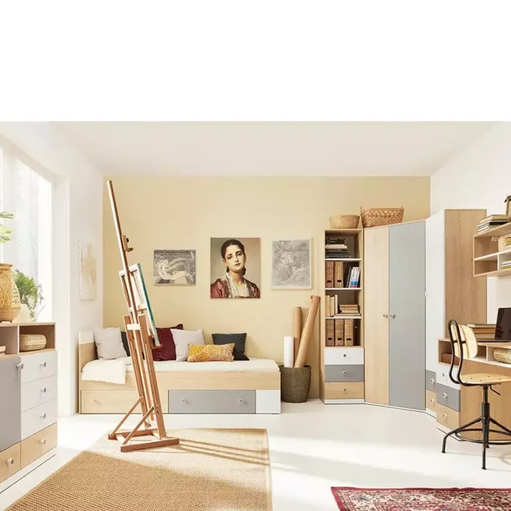Wysoki regał do pokoju młodzieżowego z kolekcji PATHE, to propozycja zarówno dla miłośników książek, jak i osób, które lubią mieć wszystko pod ręką, bez przeglądania szafek w poszukiwaniu tej jednej potrzebnej akurat rzeczy. Poza kilkoma otwartymi półkami regał posiada również trzy praktyczne szuflady, każdy z trzech frontów jest w innym kolorze białym, szarym oraz dębu biszkoptowego.