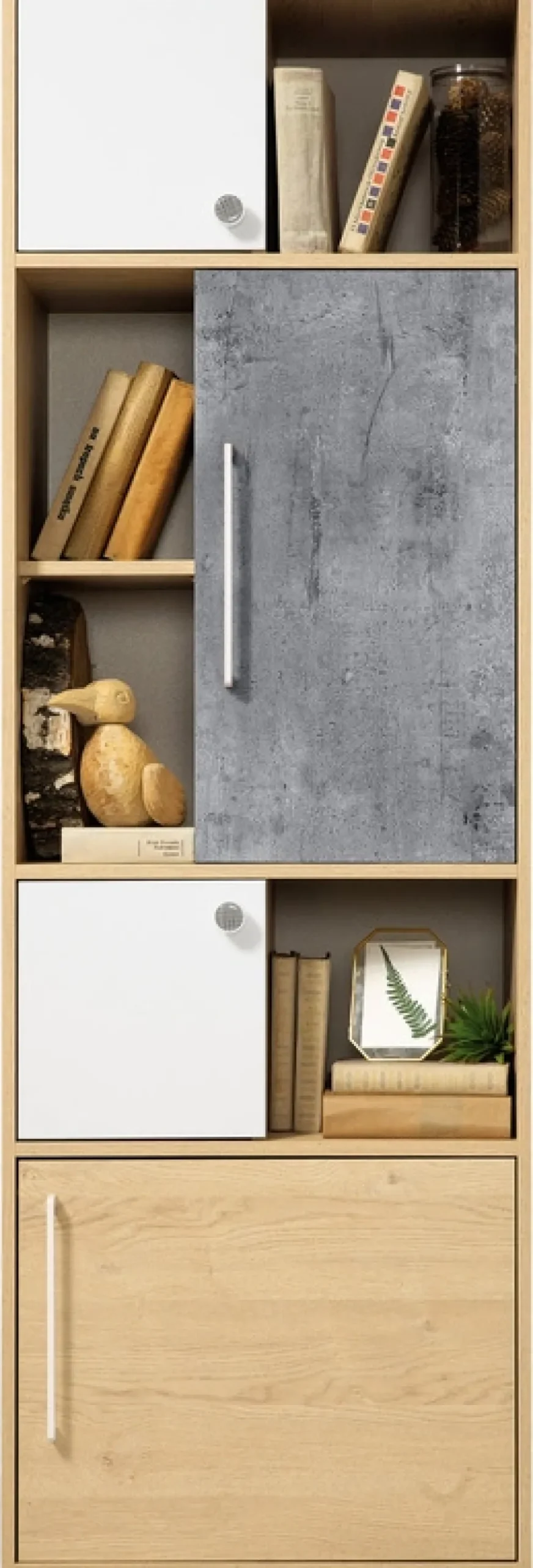 Natomiast jako miejsce do przechowywania większej ilości rzeczy, od odzieży po książki może posłużyć nam nasz wysoki czterodrzwiowy regał. Regał posiada trzy wnęki, z czego w jednej z nich zamontowana jest jedna półka. Jest to idealne miejsce na umieszczenie ulubionych fotografii, czy innych ozdób, żeby wnętrze danego pomieszczenie stało się jeszcze bardziej przytulne. Otwierając drzwiczki z prawej strony, ujrzymy jeszcze jedną dodatkową półkę, która umożliwi nam łatwiejszą segregację przedmiotów.