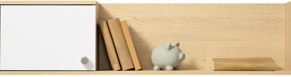 W pokoju młodzieżowym nie może zabraknąć miejsca na wyeksponowanie dyplomów, czy też pucharów za osiągnięcia naukowe lub sportowe. Dlatego w naszym zestawie znajdziecie dwie półki wiszące. Obydwie o tej samej szerokości wynoszącej 120 cm. Jedna z nich została wyposażona w szafkę, w której możemy schować bardziej narażone na uszkodzenia przedmioty.