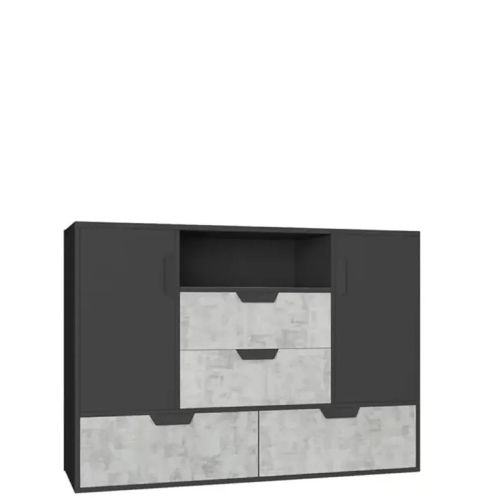 - Zestaw mebli do pokoju młodzieżowego z kolekcji NELSE zawiera biurko z szafką i szufladą oraz tacką na klawiaturę, komodę z czterema szufladami, regał otwarty z szafką oraz zamknięty, pojemną szafę oraz półkę na książki.
