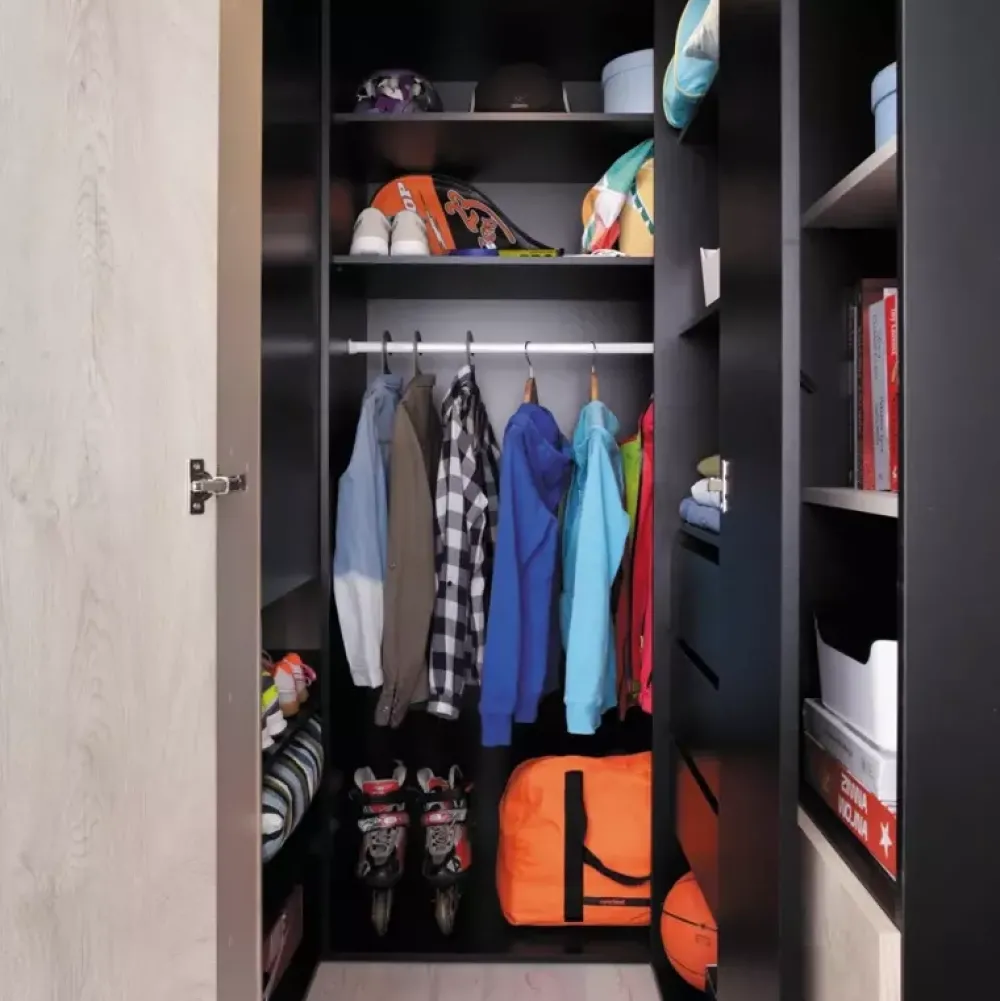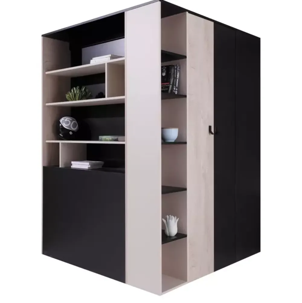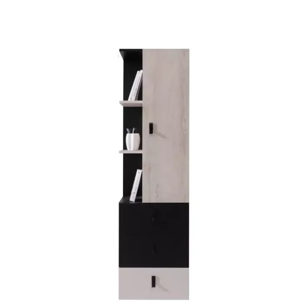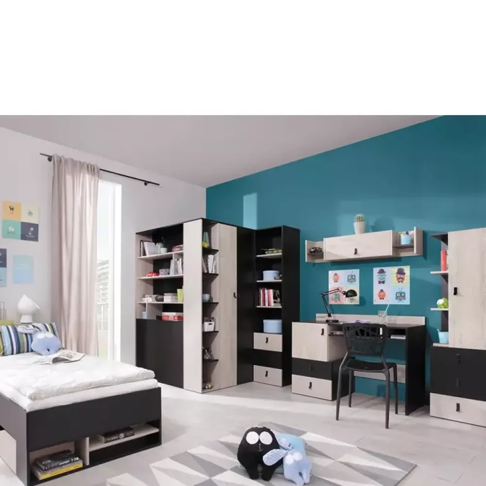 - Zestaw mebli do pokoju młodzieżowego z kolekcji PRESSCOT w skład którego wchodzi łóżko z wysuwanym panelem z półkami, szafa narożna w formie garderoby, regał na książki, biurko z szufladami, szafka wisząca oraz regał zamknięty.