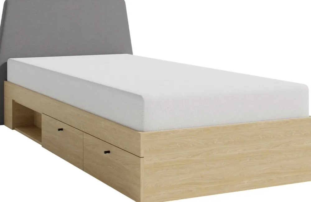 Łóżko o powierzchni spania 90×200 cm zapewnia wygodny wypoczynek każdej nocy. Solidna konstrukcja i harmonijna kolorystyka sprawiają, że to nie tylko miejsce do spania, ale także stylowy element wystroju pokoju. Idealne dopełnienie stanowi szafa narożna, która dzięki dwóm drążkom na wieszaki maksymalnie wykorzystuje przestrzeń. Pozwala na wygodne przechowywanie odzieży, zapewniając jednocześnie łatwy dostęp do każdego elementu garderoby.