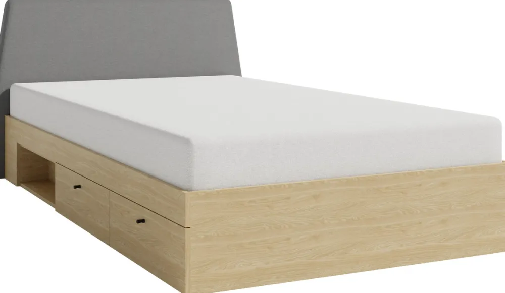 Komplet mebli młodzieżowych ALDENO to przemyślane rozwiązanie, które zapewnia komfort, porządek i estetykę w jednym. Łóżko z dwiema praktycznymi szufladami pozwala na wygodne przechowywanie pościeli czy ulubionych książek, a tapicerowany zagłówek zapewnia wsparcie podczas wieczornego czytania lub nauki. To nie tylko wygoda, ale także stylowy akcent, który nada wnętrzu przytulności.