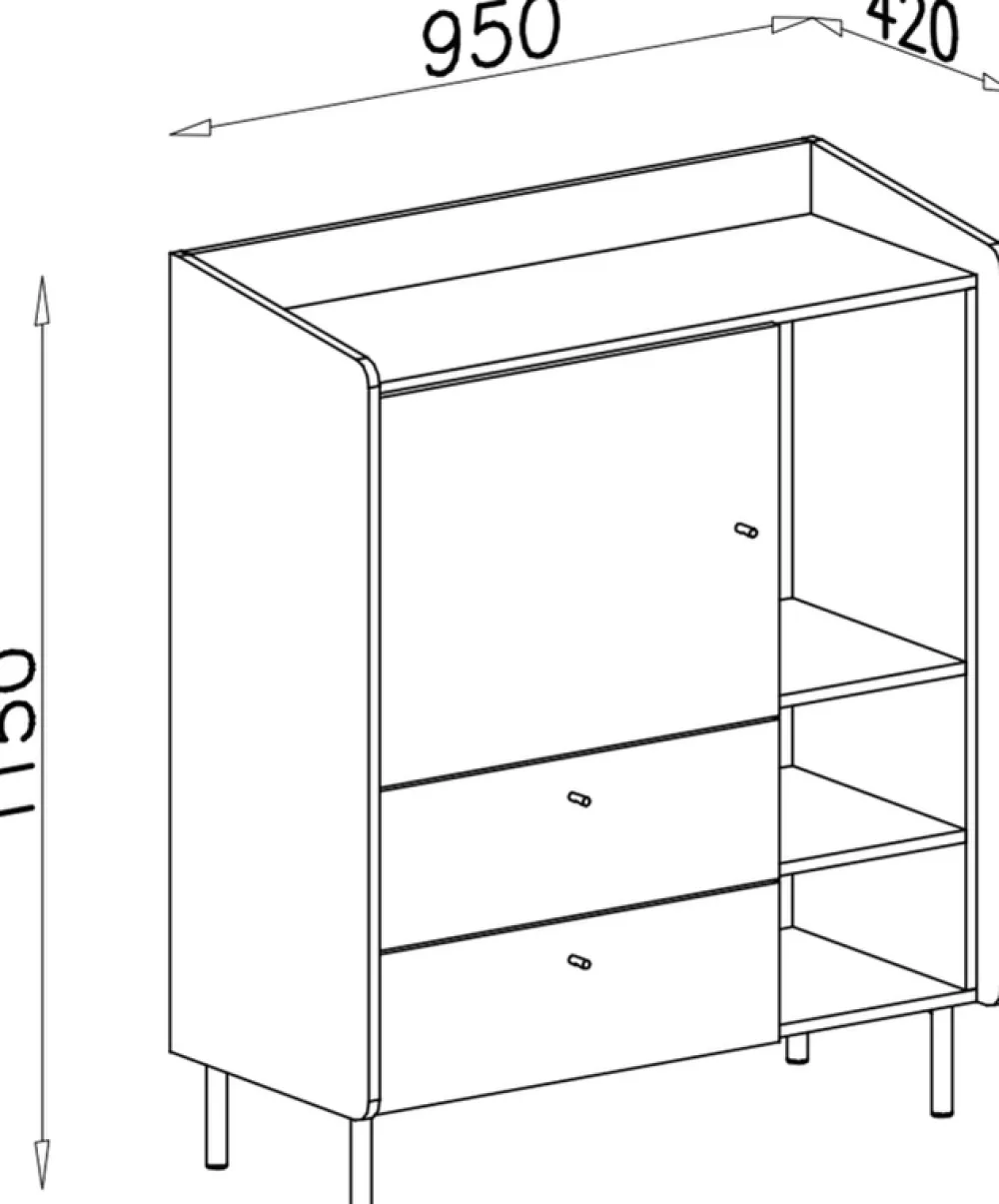 Dopełnieniem kompletu jest praktyczna komoda z półkami i dwiema szufladami. To idealne miejsce na przechowywanie zarówno codziennych drobiazgów, jak i tych ważniejszych skarbów, które zasługują na swoje specjalne miejsce.