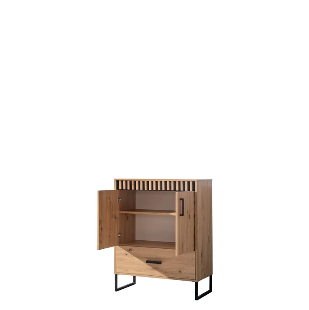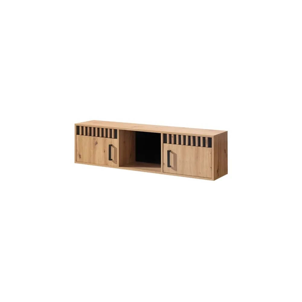 Meblościanka wykonana jest z wysokiej jakości materiałów w ciepłym kolorze dąb artisan, który dodaje wnętrzom przytulności i elegancji. Czarne detale, w tym metalowe nogi i uchwyty, podkreślają surowy, industrialny charakter stylu loftowego, tworząc mocny, ale harmonijny kontrast.