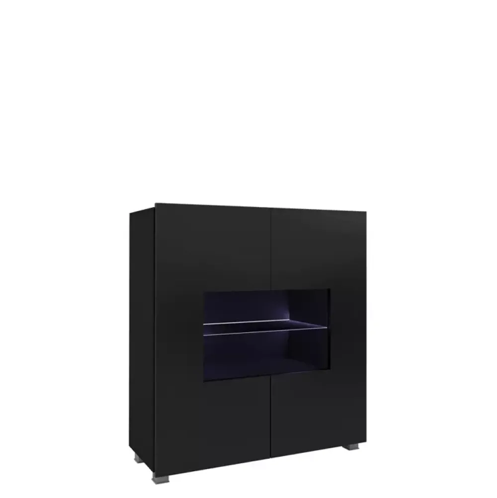 - W skład zestawu MODERN 9 wchodzą: uniwersalna szafka RTV o szerokości 100 cm, pozioma szafka wisząca, która może służyć jako barek, otwierany do góry oraz komoda ze szklaną półką, którą można podświetlić.