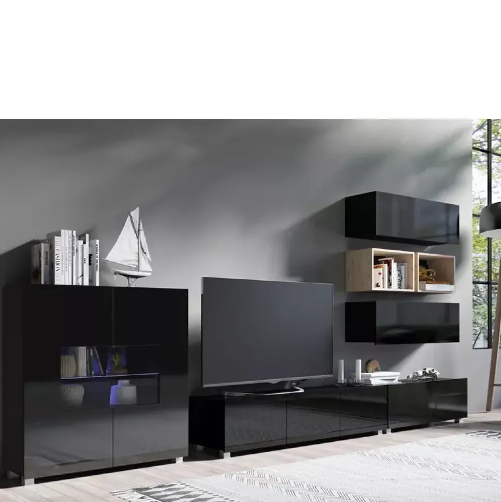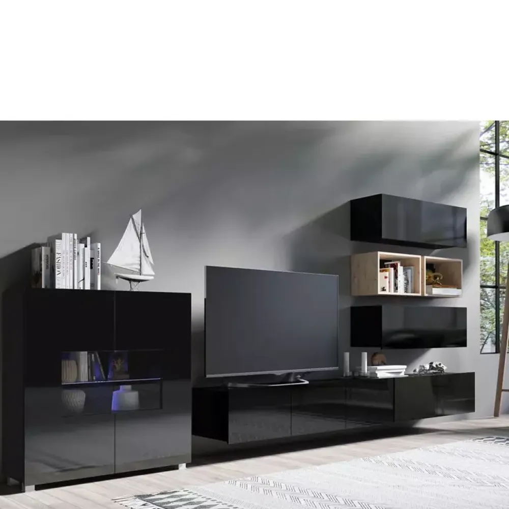 Zestaw mebli MODERN to harmonijne połączenie nowoczesnego designu z przytulnym akcentem drewna. Czarny połysk frontów dodaje wnętrzu elegancji i głębi, a ciepły dąb artisan w detalach wprowadza naturalny akcent. Komplet składa się z dwóch szafek RTV (100 i 150 cm), dwóch poziomych szafek wiszących, dwóch półek 50 cm oraz eleganckiej komody z przeszklonym frontem i możliwością podświetlenia – idealnej do wyeksponowania dekoracji.