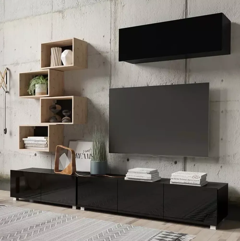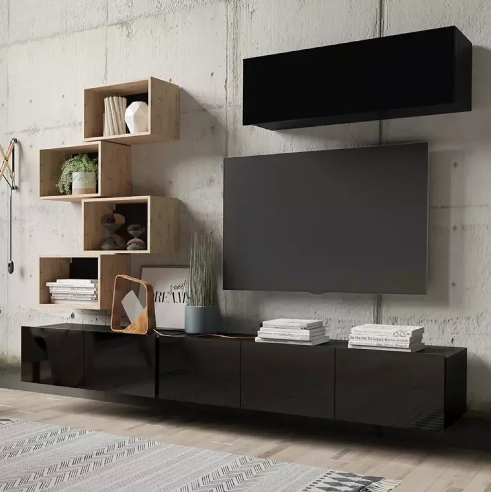 Nowoczesna meblościanka MODERN to zestaw, który łączy połyskującą czerń z naturalnym odcieniem dębu artisan, tworząc stylową kompozycję idealną do salonów urządzonych ze smakiem. W skład kompletu wchodzi szafka RTV 150 cm, szafka RTV 100 cm, jedna pozioma szafka wisząca oraz cztery półki ścienne, które oferują wiele możliwości aranżacyjnych.