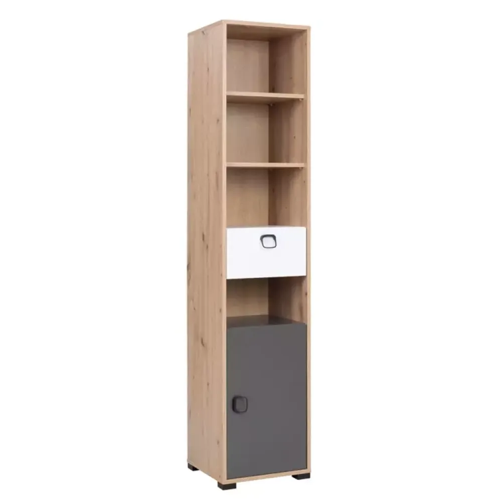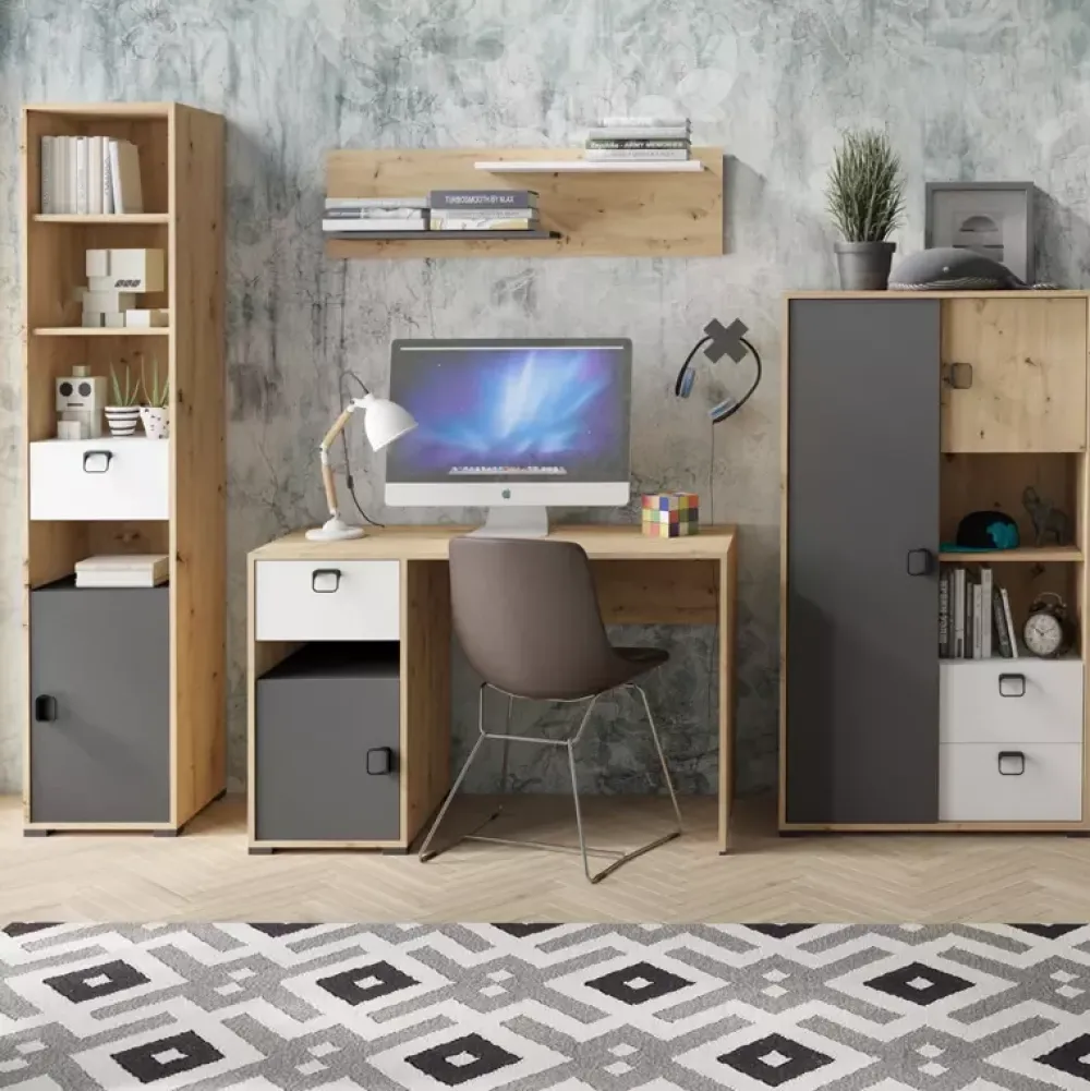 Młodzieżowa meblościanka z biurkiem CAMERUN wprowadzi świeżość i funkcjonalność do każdego pokoju młodzieżowego! Stworzona z myślą o potrzebach współczesnej młodzieży, nasza meblościanka do pokoju młodzieżowego łączy w sobie wygodę i styl. Biurko z szafką stanowi idealne miejsce do nauki, pracy i twórczego spędzania czasu. Jego ergonomiczna konstrukcja pozwala na komfortowe korzystanie, a dodatkowe miejsca do przechowywania ułatwiają utrzymanie porządku w otoczeniu. Regał na książki to przestrzeń, która pomieści najważniejsze lektury, podręczniki i albumy. Przemyślane rozwiązanie pozwala na łatwy dostęp do ulubionych pozycji, jednocześnie zachęcając do odkrywania nowych światów. Regał z drzwiami i szufladami to wszechstronna przestrzeń do przechowywania. Dzięki niemu Twoje dziecko będzie mogło schować ubrania, akcesoria, a także pamiątki, tworząc uporządkowane i przytulne wnętrze. Półka na książki to doskonałe uzupełnienie całego zestawu. Pozwala na wyeksponowanie ulubionych tytułów, zdobyczy z podróży czy innych cennych przedmiotów, które dodadzą osobistego charakteru przestrzeni. Nowoczesna meblościanka młodzieżowa łączy w sobie elegancję i funkcjonalność, sprawiając, że pokoje młodzieżowe stają się miejscem, w którym chce się spędzać czas. Wybierz naszą meblościankę do pokoju młodzieżowego i przekonaj się, jak może ona odmienić wnętrze na lepsze.