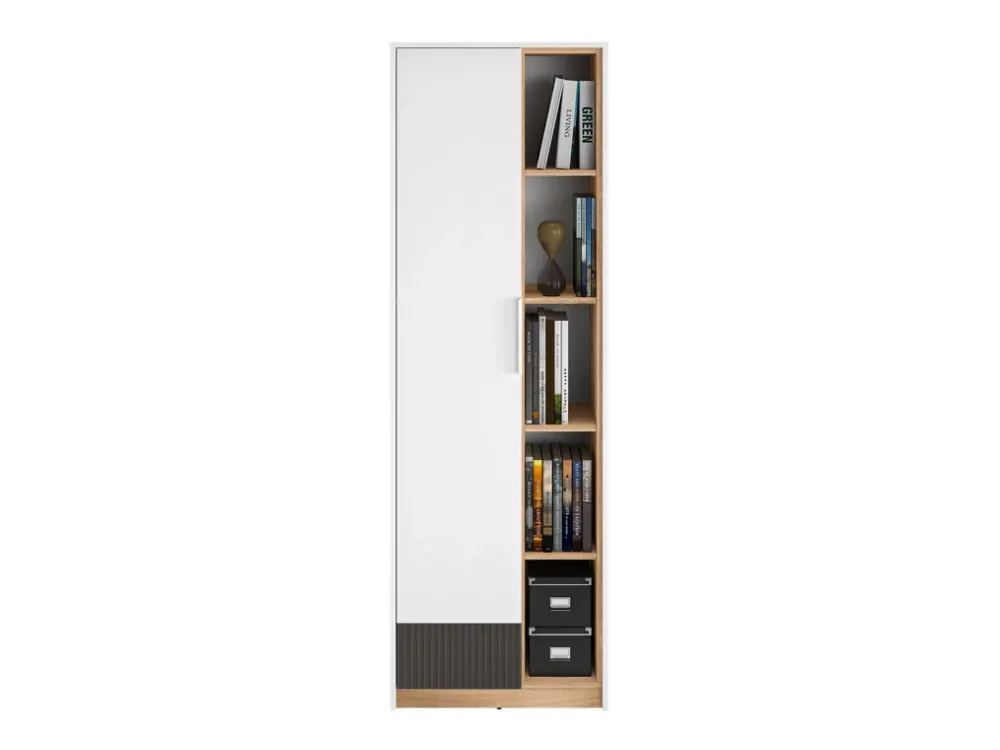 Za lewymi drzwiami regału znajdują się cztery przestronne półki, które doskonale sprawdzą się do przechowywania książek, odzieży, akcesoriów czy innych niezbędnych przedmiotów. To idealne miejsce na te rzeczy, które warto mieć pod ręką, ale niekoniecznie na widoku. Dzięki temu regał pozwala zachować porządek i schludny wygląd pokoju.