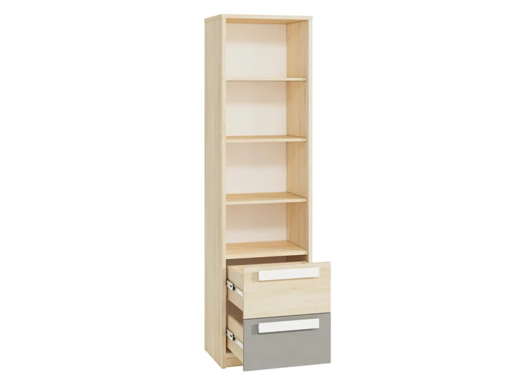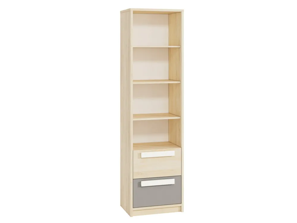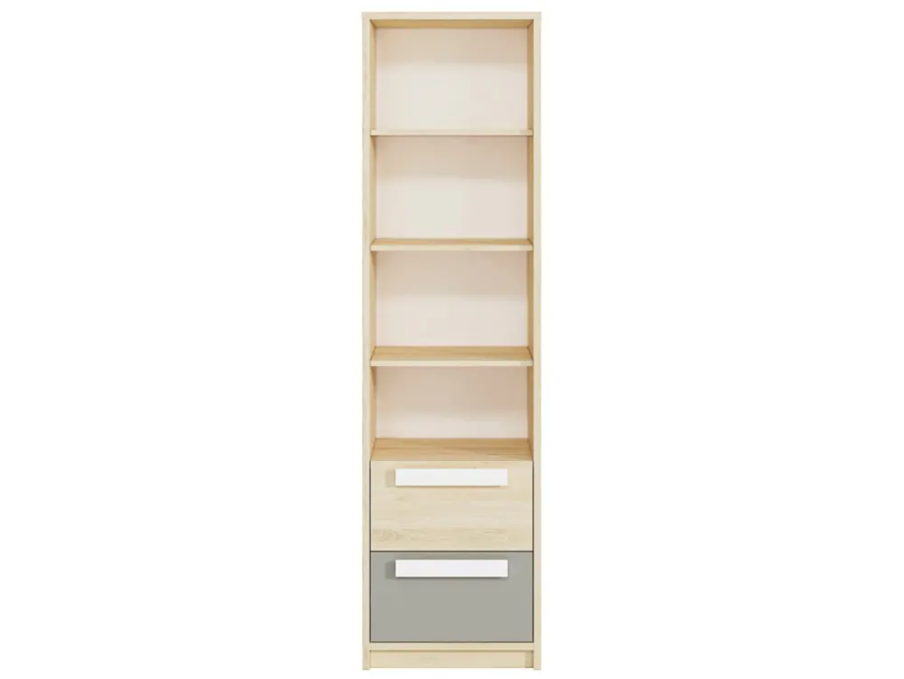 Regał został wyposażony w dwie przestronne szuflady na prowadnicach kulkowych, które zapewniają wygodę i komfort użytkowania. Szuflady otwierają się lekko i bezszelestnie, co jest szczególnie ważne w codziennym użytkowaniu. Pomieszczą one wszystkie niezbędne drobiazgi, książki czy akcesoria szkolne, pomagając utrzymać porządek w pokoju.