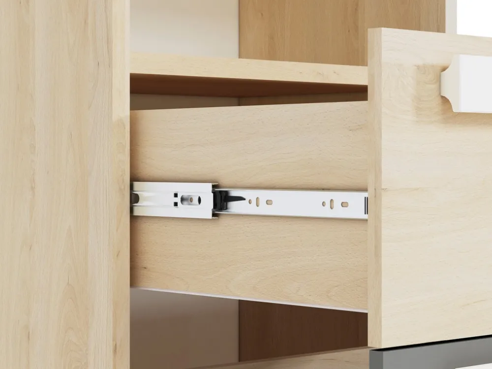 - Regał został wyposażony w dwie pojemne szuflady, które poruszają się na prowadnicach kulkowych.