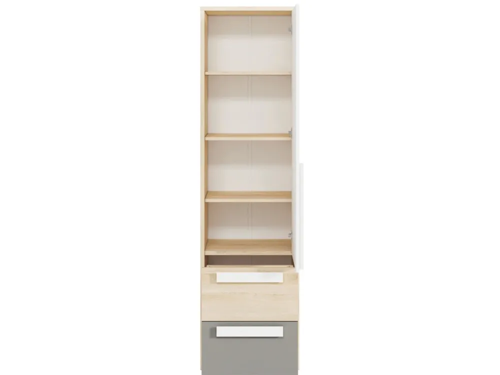 Regał wyposażony jest w dwie szuflady na prowadnicach kulkowych, które zapewniają łatwe i płynne wysuwanie. To doskonałe miejsce na przechowywanie różnych drobiazgów, książek czy innych osobistych przedmiotów. Dzięki temu pokój młodzieżowy będzie zawsze schludny i dobrze zorganizowany.