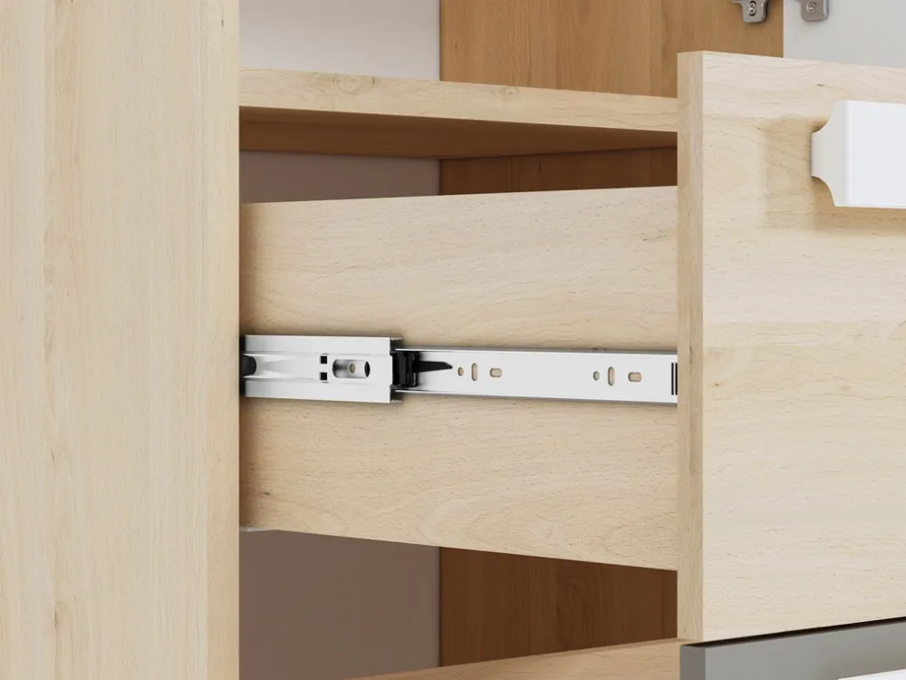 - Regał został wyposażony w dwie pojemne szuflady, które poruszają się na prowadnicach kulkowych.