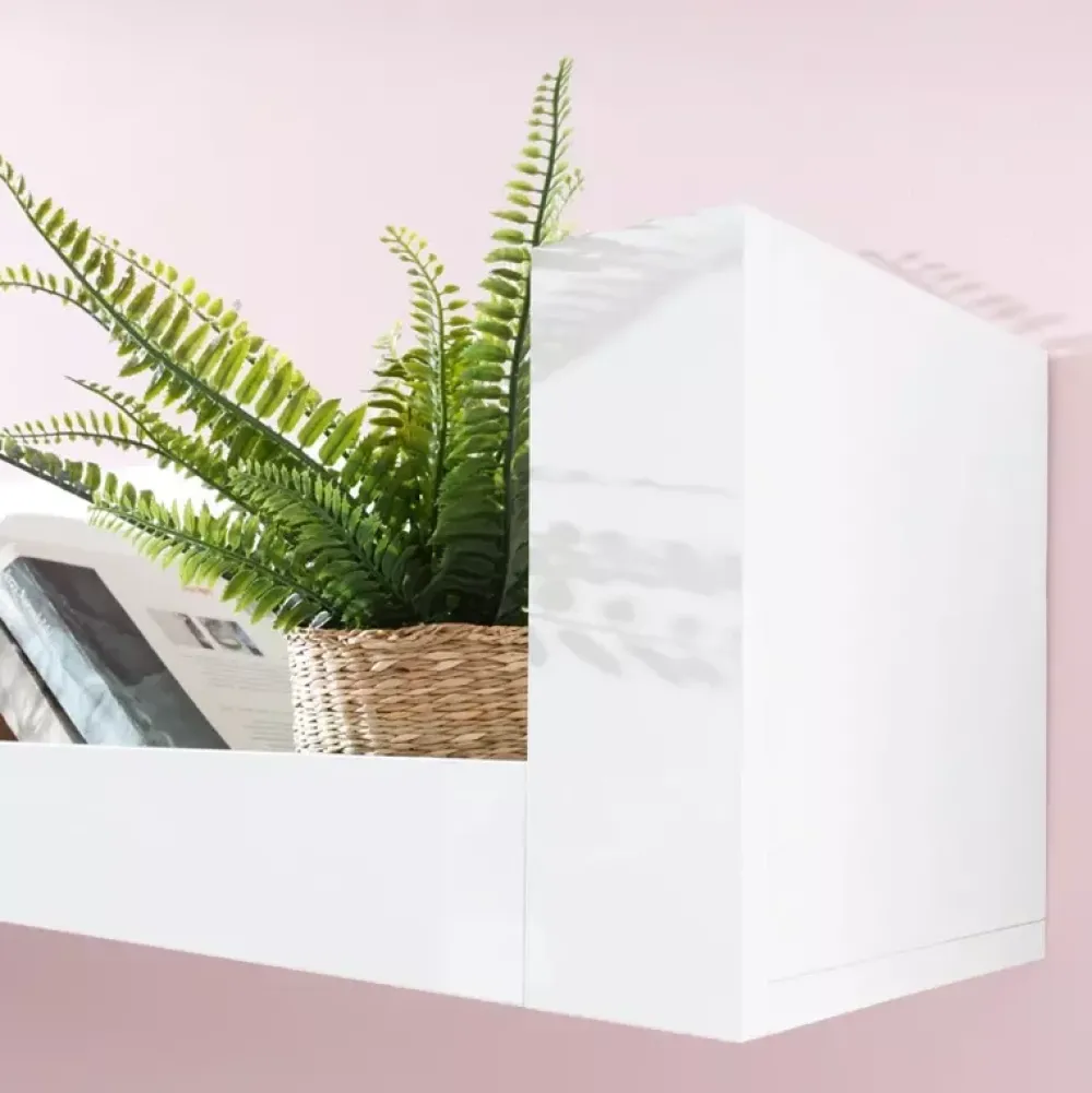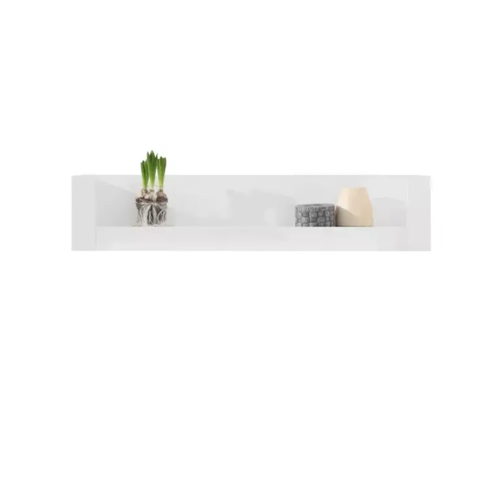 - Półka wisząca w kolorze białym o szerokości 120 cm z zakończeniami na bokach.