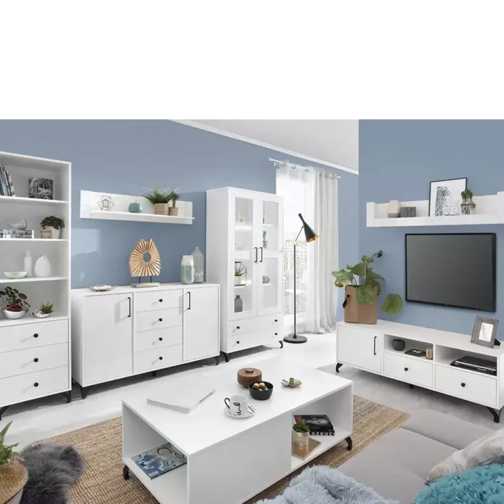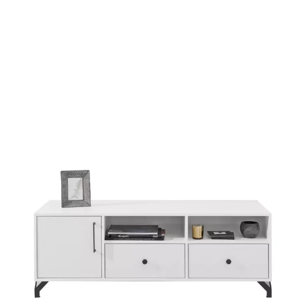 - Nowoczesna szafka RTV o szerokości 140 cm w kolorze białym. Wyposażona w dwie szuflady i jedną szafką oraz dwie wnęki na sprzęt RTV.
