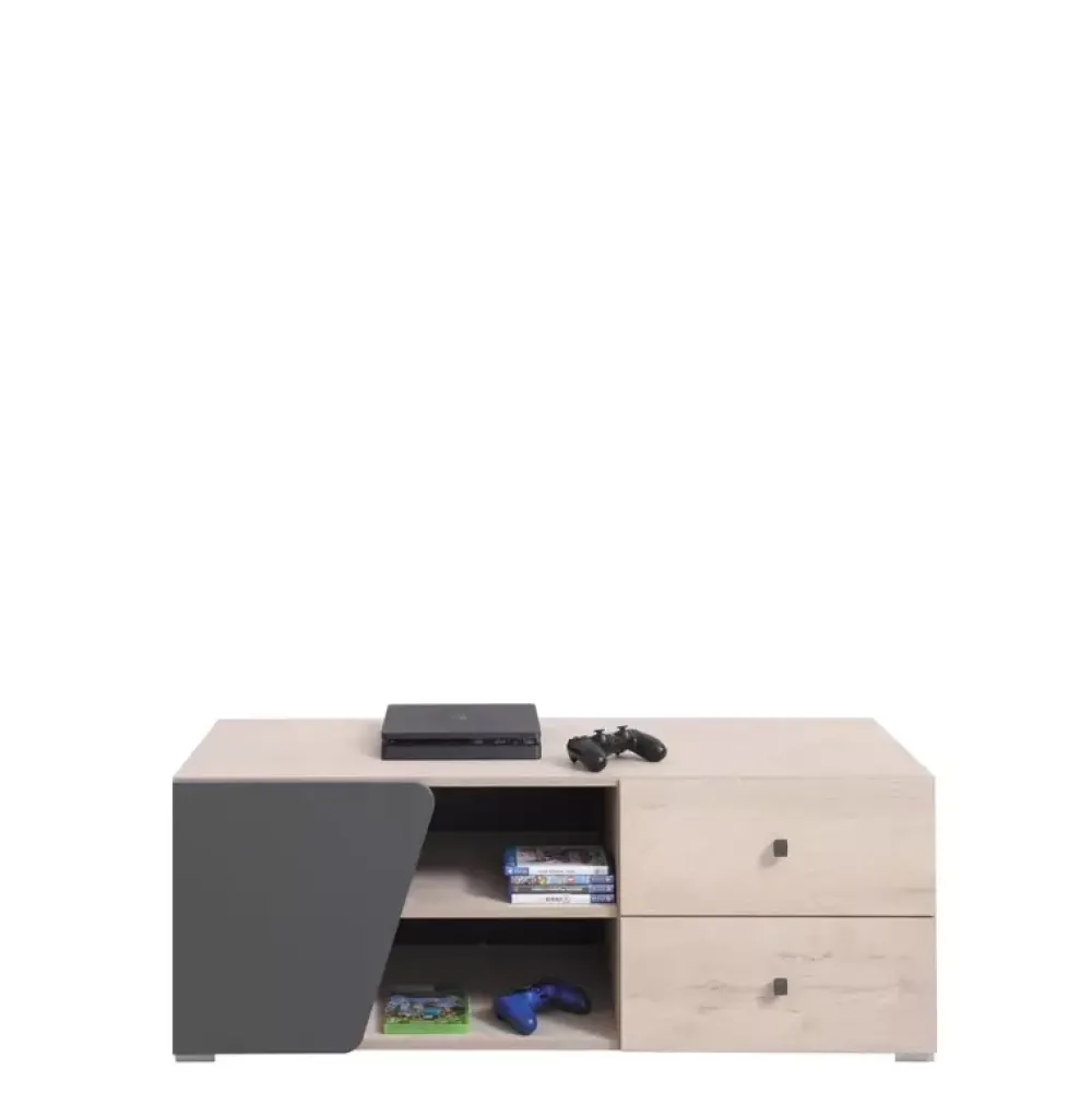 - Szafka pod telewizor do pokoju młodzieżowego z dwiema szufladami i dwiema dużymi wnękami na konsole lub innych sprzęt RTV.