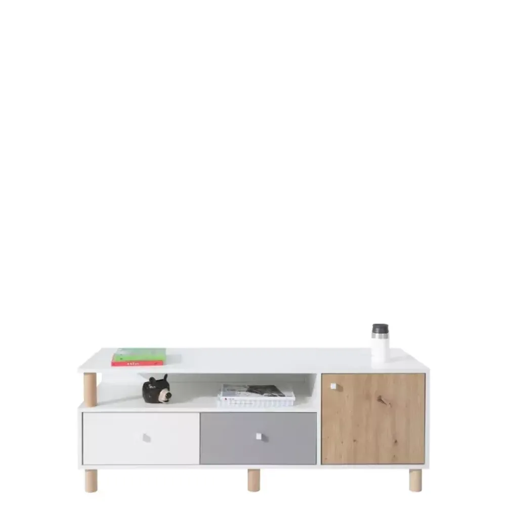 Młodzieżowa szafka RTV w kolorze białym, z dwiema szufladami na gry lub filmy, jeden front w kolorze szarym, drugi w kolorze korpusu. Po prawej stronie znajduje się pojemna szafka z drzwiczkami w kolorze dąb artisan.