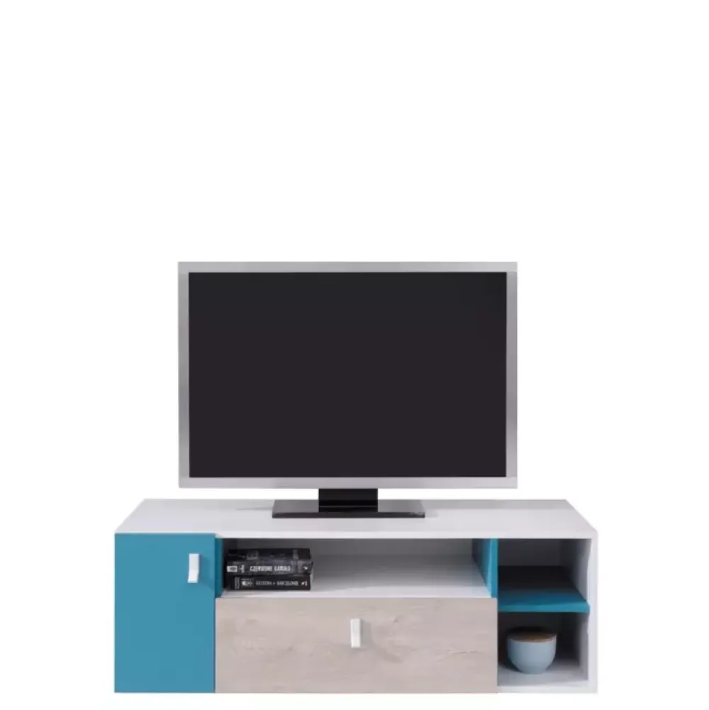 Szafka RTV z kolekcji mebli systemowych PRESSCOT w skład której chodzi wiele nowoczesnych brył, dzięki modnej stylistyce, idealnie sprawdzi się jako miejsce na twój telewizor, pojemna szuflada u dołu szafki zadba o twoje akcesoria, a półki po bokach będą świetnym miejscem na drobne dekory, a morski kolor z pewnością ożywi twoje pomieszczenie.