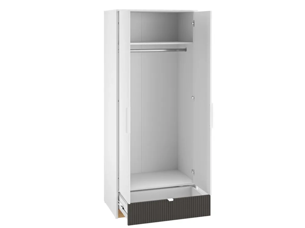 Wnętrze szafy zostało zaprojektowane tak, aby maksymalnie ułatwić organizację ubrań i akcesoriów. Za dwojgiem drzwi kryje się przestronna półka oraz aluminiowy drążek na wieszaki. To idealne miejsce na przechowywanie codziennych ubrań, które wymagają powieszenia – od koszul, przez bluzy, po lekkie kurtki.