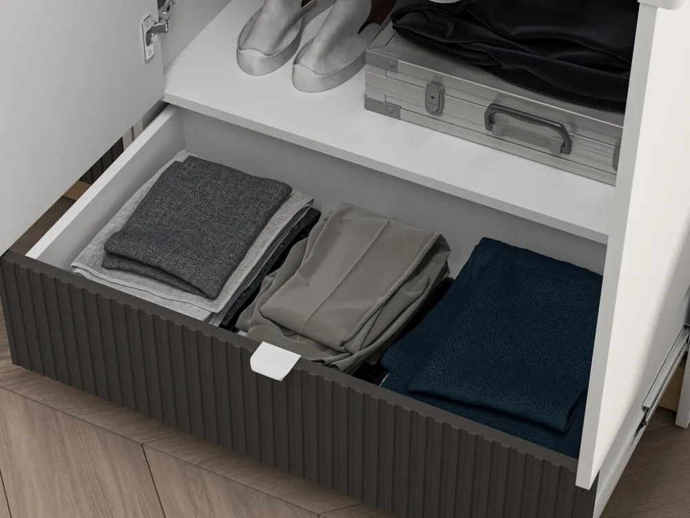 Na dole szafy znajduje się pojemna szuflada, która pomieści drobne akcesoria, bieliznę lub inne przedmioty, które chcesz mieć zawsze pod ręką. Dzięki temu wszystkie rzeczy będą miały swoje miejsce, a utrzymanie porządku stanie się znacznie prostsze.