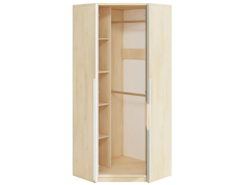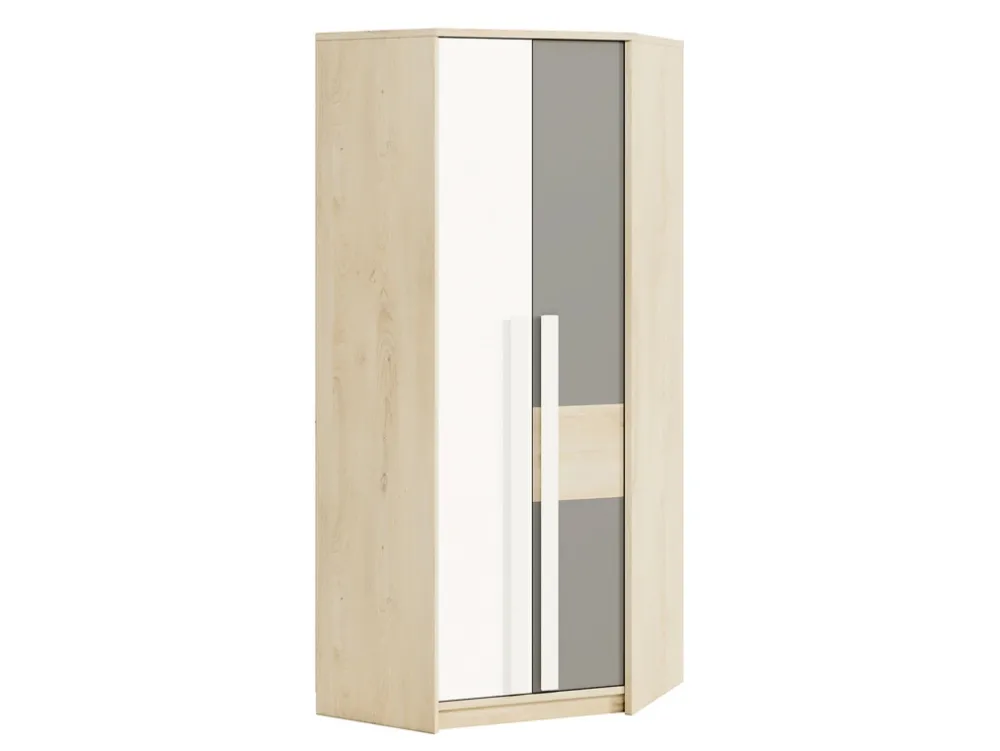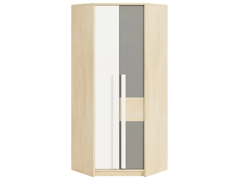 - Młodzieżowa szafa w stylu skandynawskim DROP wykonana z płyty laminowanej, krawędzie dodatkowo zabezpieczono okleiną ABS. Szafa narożna wyposażona w cztery półki oraz dwa drążki na wieszaki. Uchwyty wykonane z drewna w białym kolorze.