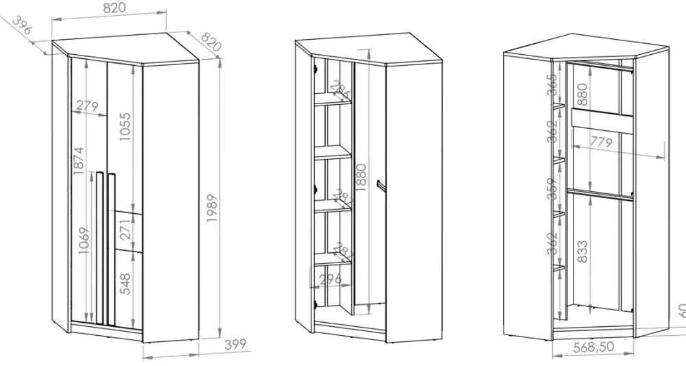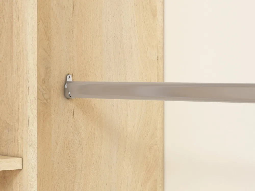 - Szafa posiada cztery półki z lewej strony oraz dwa drążki na wieszaki z prawej, takie ustawienie zapewnia odpowiednią ilość miejsca do przechowywania odzieży.