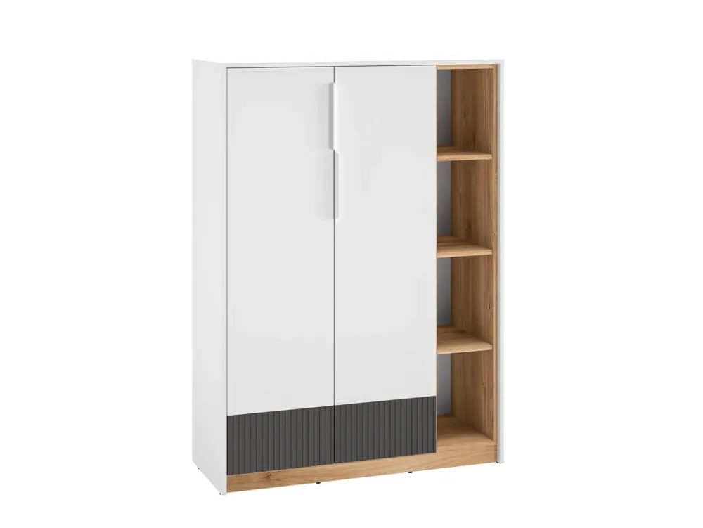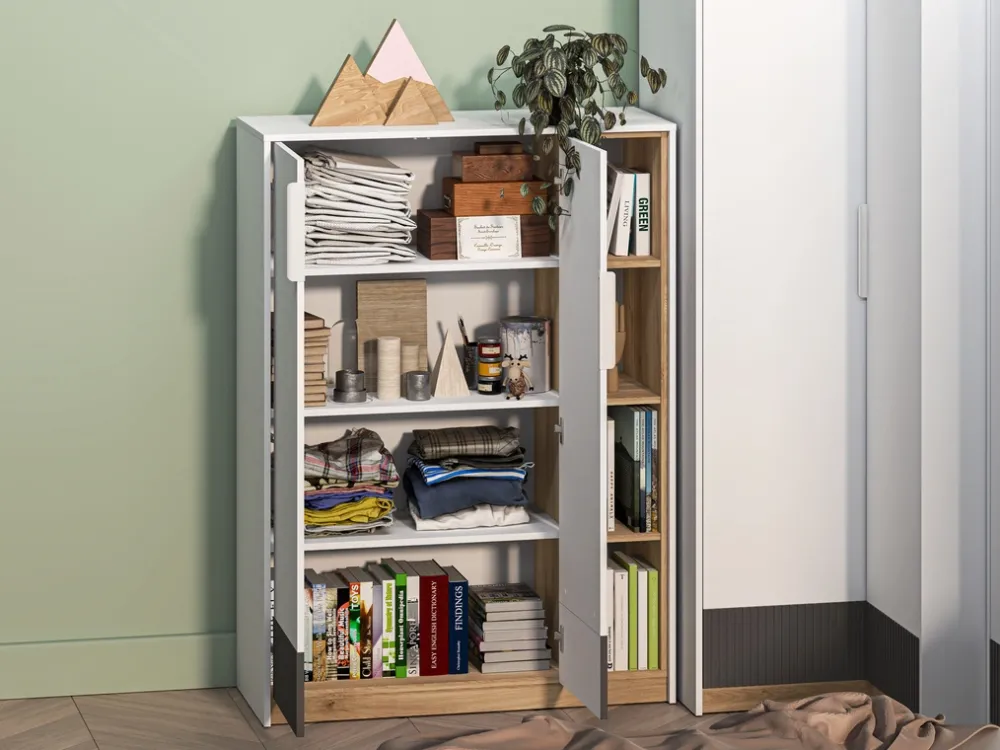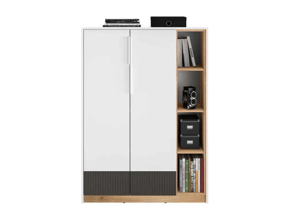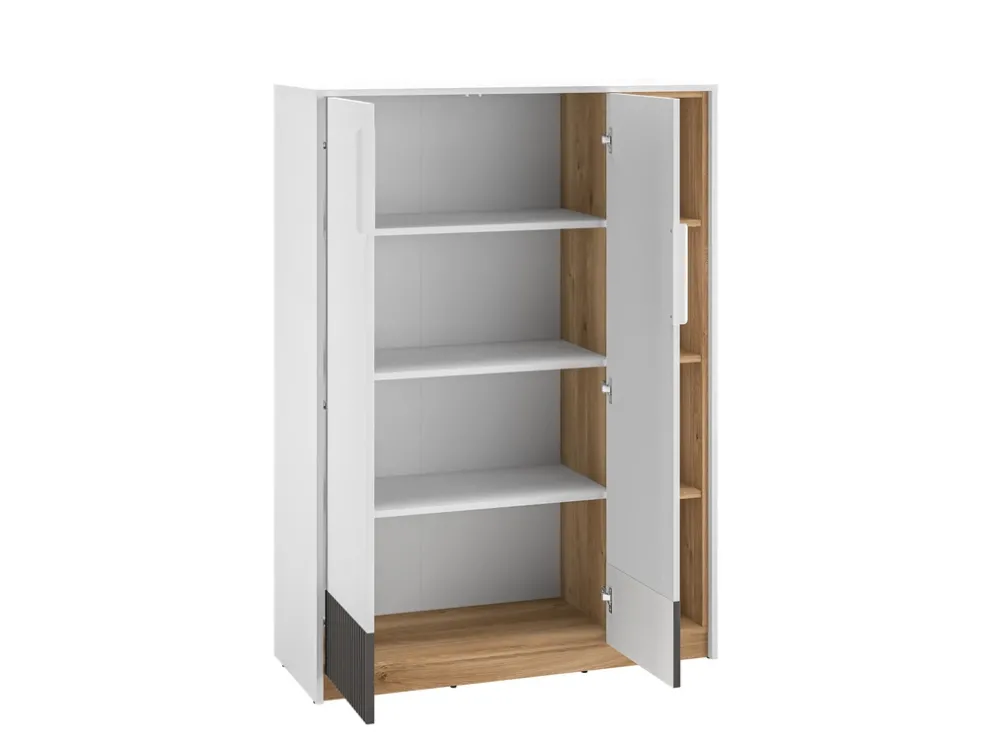 Regał został zaprojektowany z myślą o codziennym użytkowaniu. Wyposażony jest w parę drzwi z cichym domykiem, co zapewnia komfortowe zamykanie i otwieranie bez hałasu. Za drzwiami znajdziesz aż cztery półki, które idealnie sprawdzą się do przechowywania ubrań, książek czy innych przedmiotów, które chcesz ukryć przed wzrokiem.