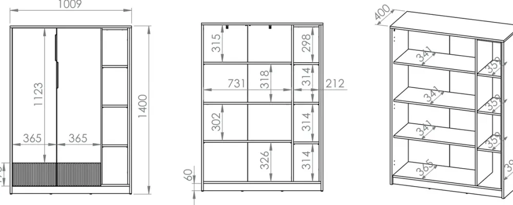 Po prawej stronie regału znajdują się cztery otwarte półki, które oferują mnóstwo miejsca na wyeksponowanie książek, akcesoriów dekoracyjnych lub innych przedmiotów, które są dla Ciebie ważne. To idealne miejsce na organizację przestrzeni w sposób, który będzie odpowiadał Twoim potrzebom.