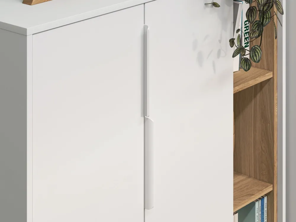 - Uchwyty zostały wykonane z aluminium w białym kolorze. Zaokrąglenie boczne czyni doskonałą dekorację mebla.
