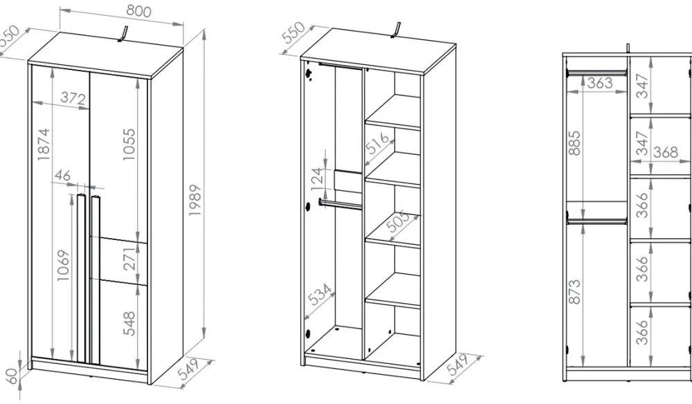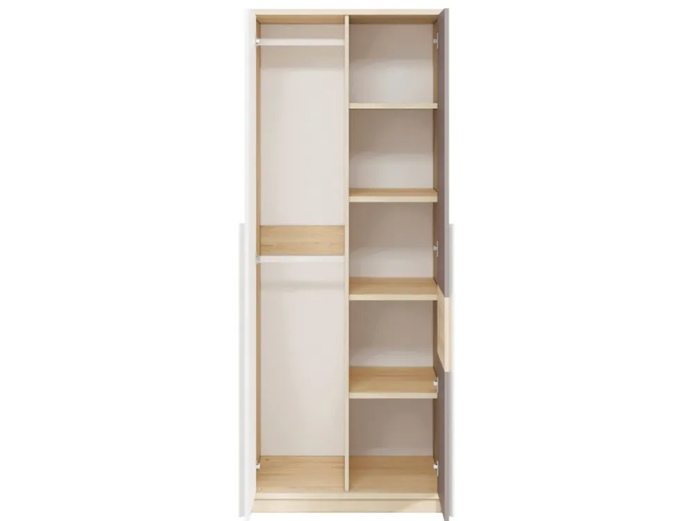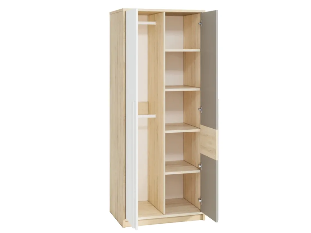 - Szafa posiada cztery półki z lewej strony oraz dwa drążki na wieszaki z prawej, takie ustawienie zapewnia odpowiednią ilość miejsca do przechowywania odzieży.