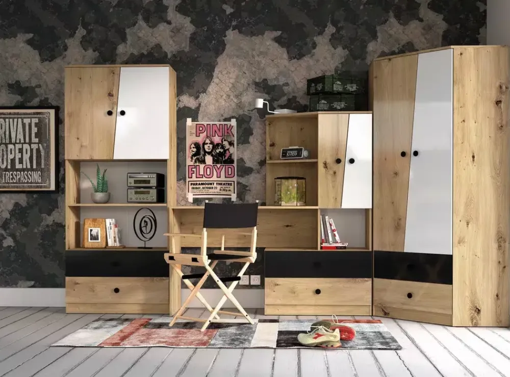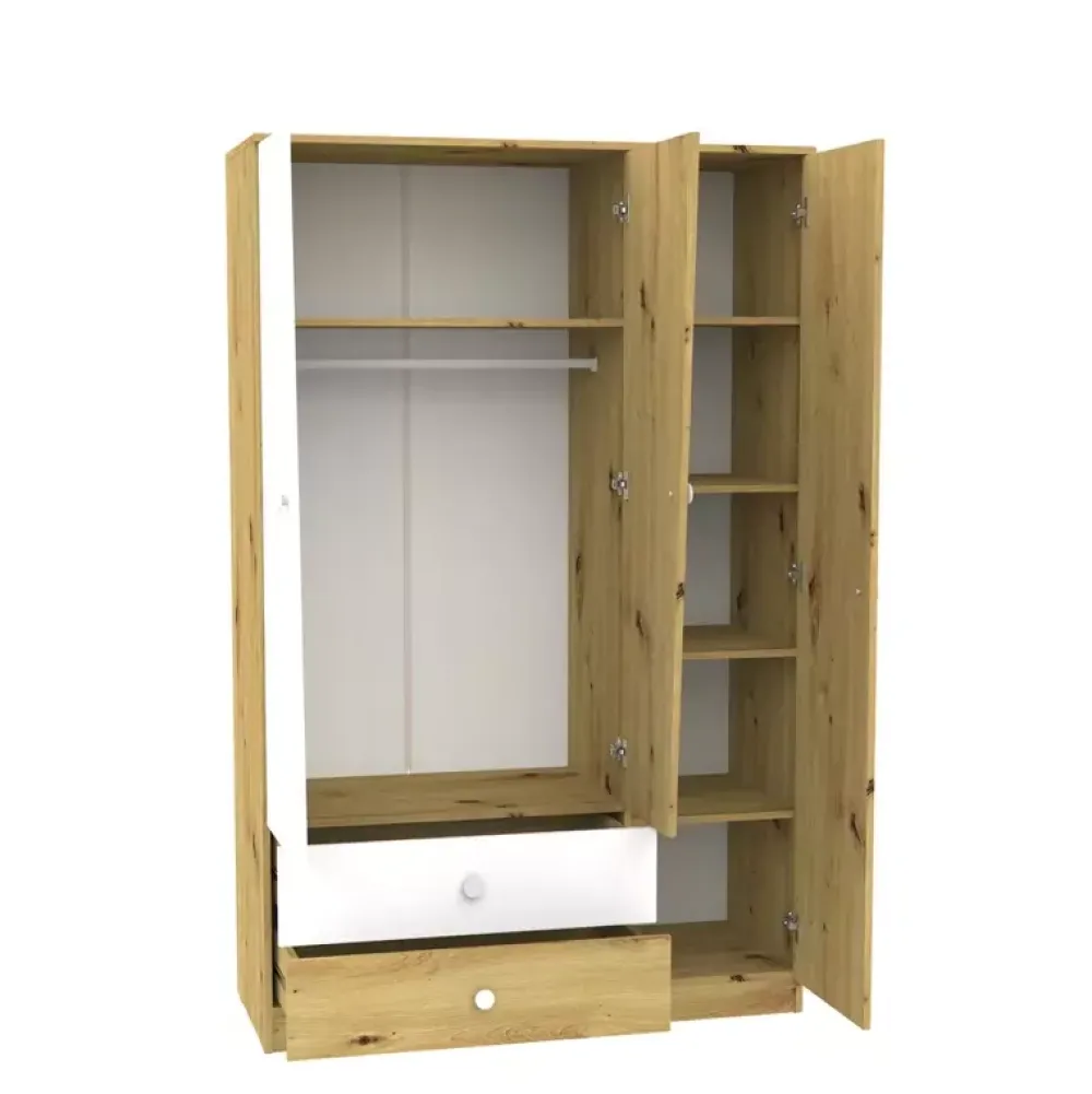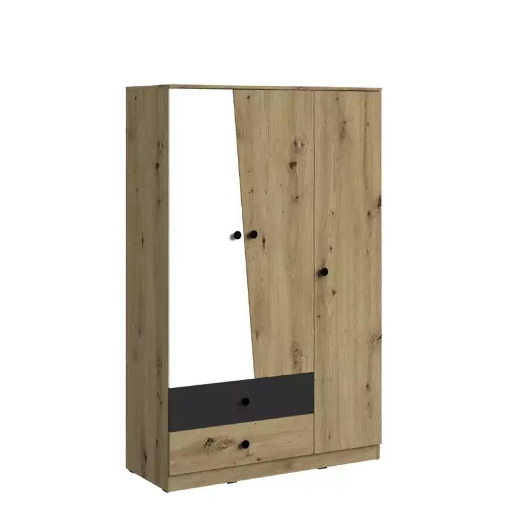 - Młodzieżowa trzydrzwiowa szafa w kolorze Dąb Artisan z kolekcji MONACO. Duża szafa została wyposażona w trzy drzwi, oferuje ogromną przestrzeń na wieszaki razem z drążkiem oraz 5 półek i dwie duże szuflady do zagospodarowania.