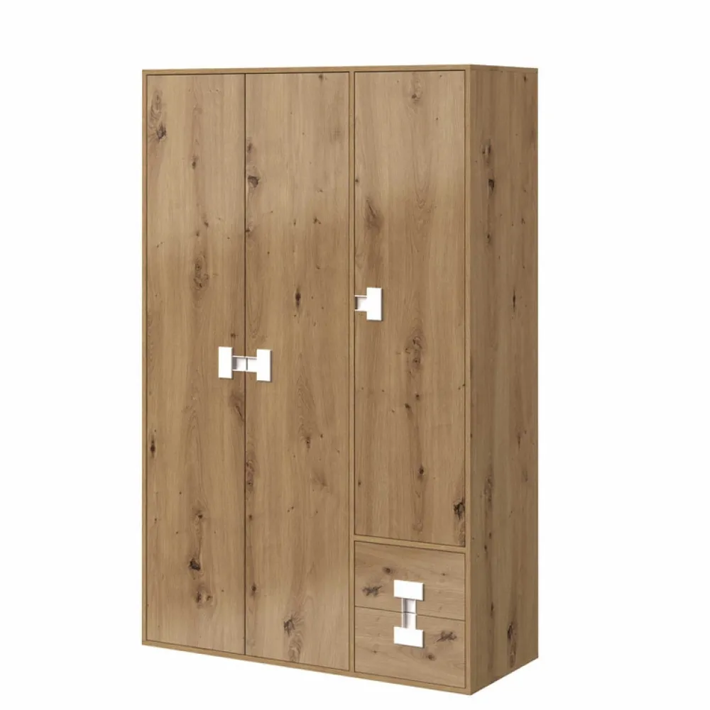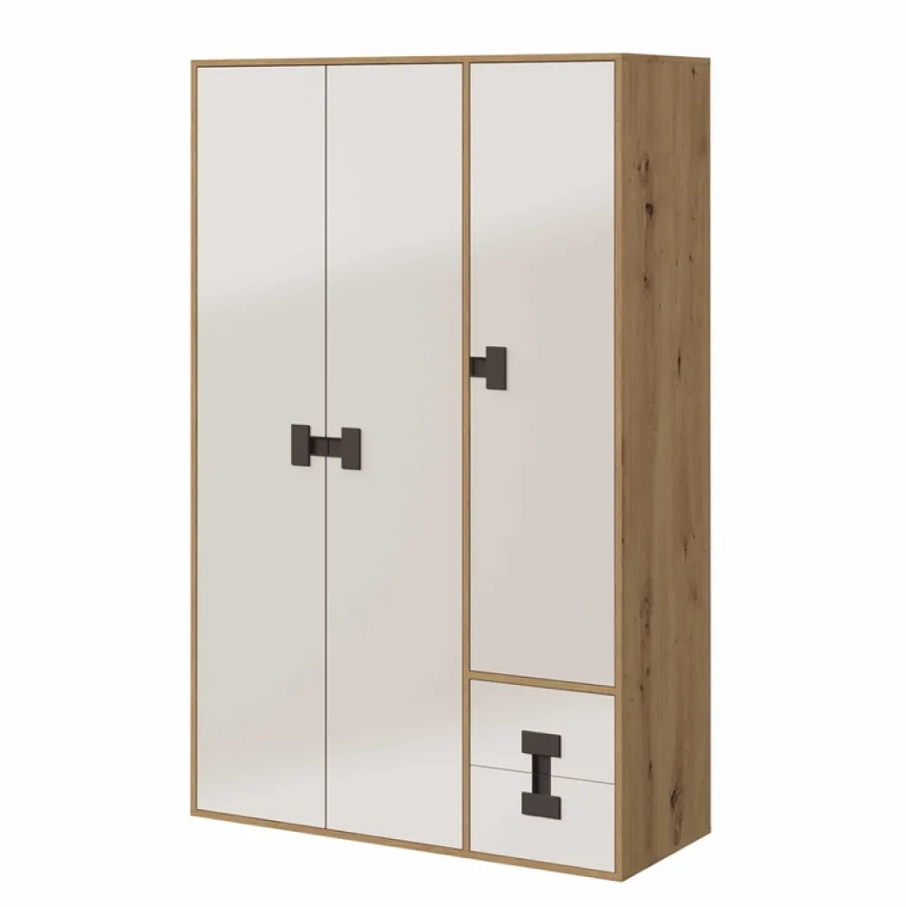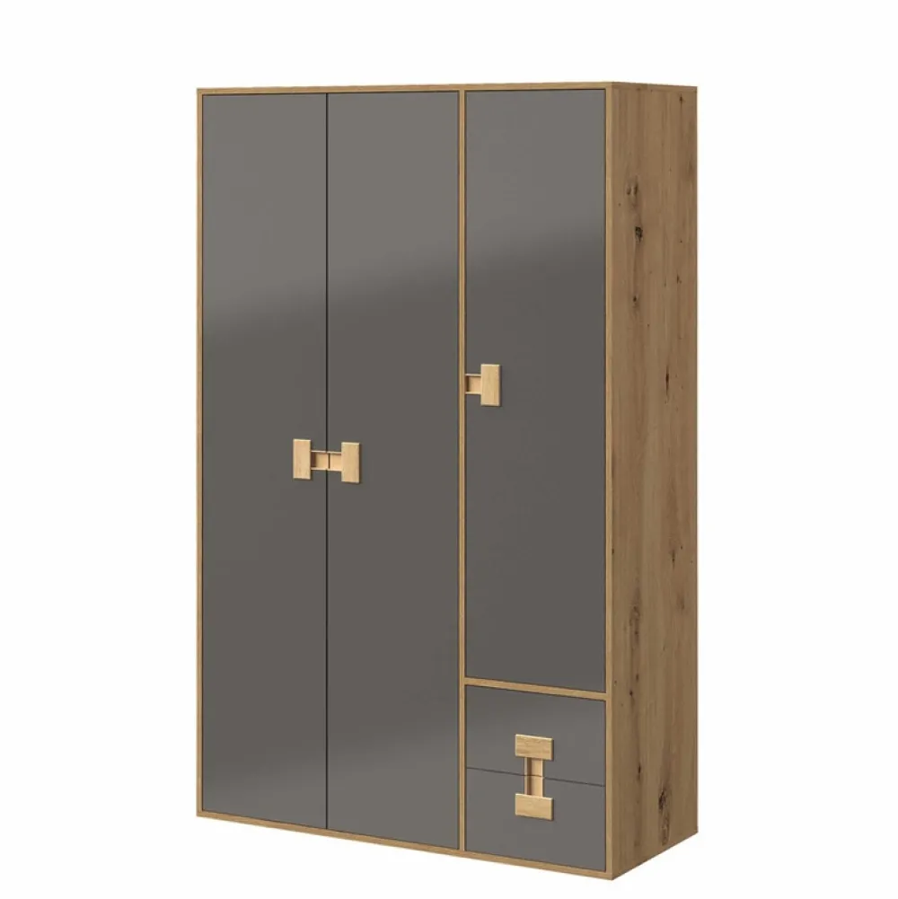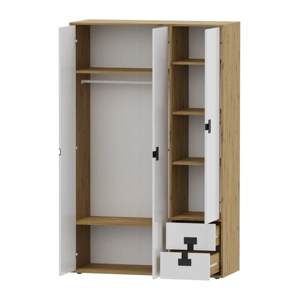- Duża nowoczesna szafa 120 cm w kolorze Dąb Artisan z kolekcji INDEX. Szafa 120 cm została wyposażona we dwie szuflady, nad którymi znajdziemy cztery półki. Po lewej stronie zaaranżowano dwie duże półki oraz przestrzeń z drążkiem na wieszaki.